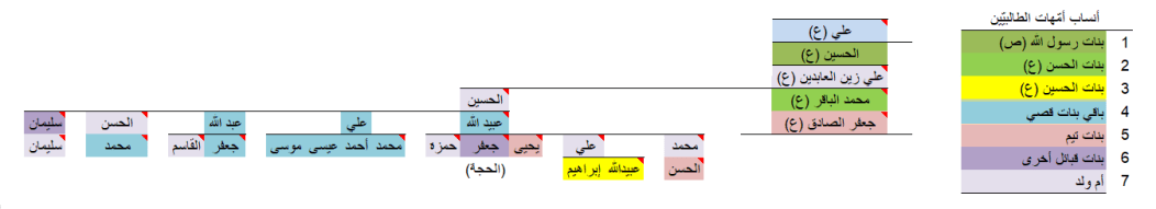 - ذريّة عبد الله العقيقي، وهي منحصرة في 32 فرعٍ متنقّلٍ بين الحجاز ومصر وجنوب العراق وبلاد الريّ (لا سيّما الحائر الحُسيني الشريف والبصرة والأهواز) وصولاً إلى جرجان في خراسان. وهذه الذريّة تتمثّل اليوم بالتكتّل المُتكرّر DYS462=12 وفروعه الجينيّة الثلاث (الطالقانيّة والكربلائيّة والبصريّة-الأهوازيّة، بغضّ النظر عن مواريث أصحابها).