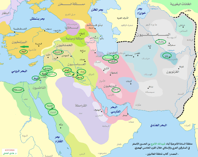 وهذه خريطة مبسّطة توضح تنقلات التكتّلات الحُسينيّة الأصغريّة الباقية في ممالك المشرق والحالة السياسيّة التي عايشها الكاتب وباقي الطالبيّين بين القرنين الرابع والخامس الهجري: