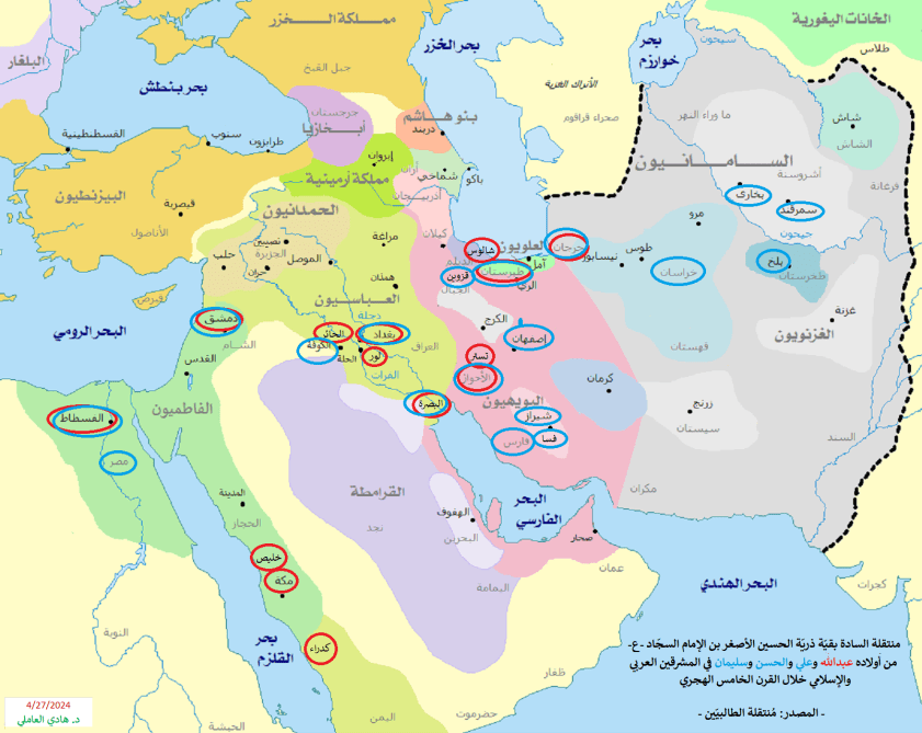 وهذه خريطة مُبسّطة توضح تنقلات الفروع ال44 في ممالك المشرق والحالة السياسيّة التي عايشها الكاتب وذريّة عبيد الله الأعرج بين القرنين الرابع والخامس الهجري: