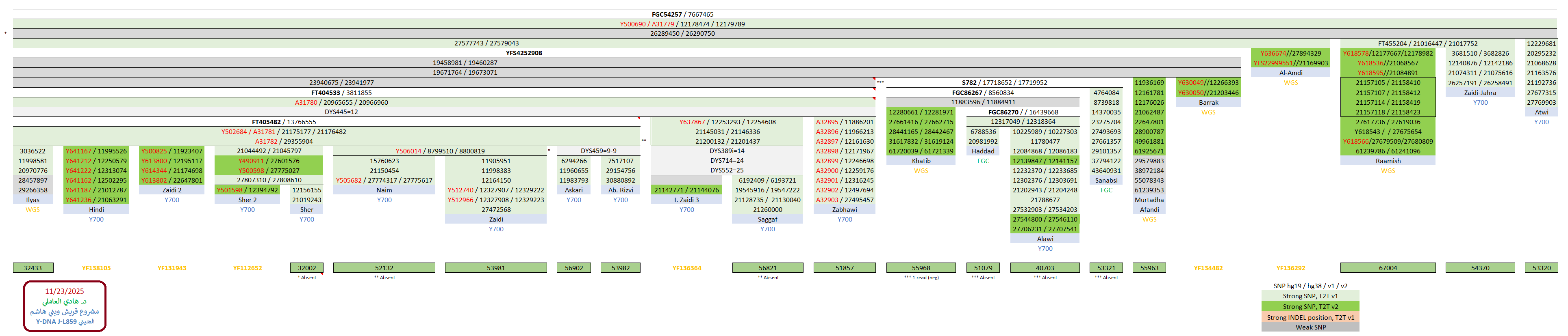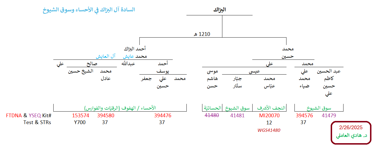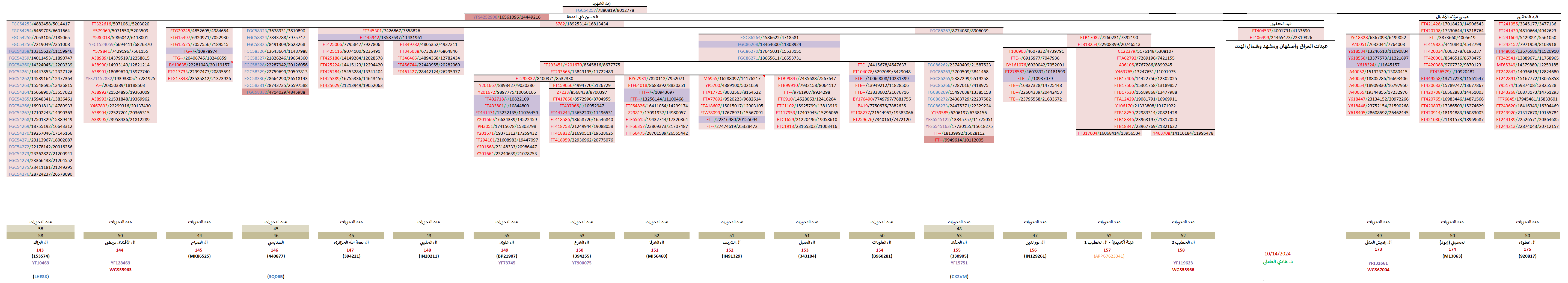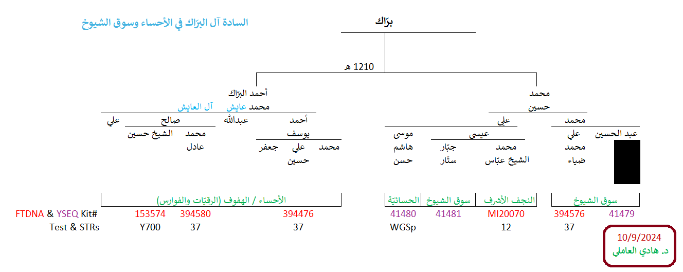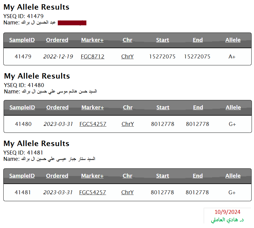 مواضيع مُتعلّقة: منتقلة الزيديّة وهيكليّتهم الجينيّة – خرائط ومشجرات ، نتيجة ثالثة للسادة آل زيدي الحُسيني Y700 ، عيّنة السادة “السقاف” Y700 ، نتيجة السادة آل حسين الحُسيني Y700 ، نتيجة Y700 لآل الهندي “الزيود” ، نتيجة Y700 رابعة لسادات البارا آل زيدي ، نتيجة Y700 لسادات البارا آل زيدي الحُسيني ، نتيجة السادة آل الزيدي الحُسيني Y700 ، عيّنة السادة الندوي ، نتيجة ثانية Y700 للسادة آل حيدر Rizvi الحُسيني ، نتيجة السادة آل عباس الرضوي Y700 ، نتيجة السادة آل عسكري الرضوي Y700 ، نتيجة السادة آل حيدر الرضوي Y700 ، نتيجة Y700 ثانية للسادة آل شير الأسد ، نتيجة السادة آل شير الأسد Y700 ، نتيجة السادة آل نعيم الحسيني Y700 ، نتيجة السادة آل إلياس الحُسيني WGS ، عيّنة السادة الندوي ، نتيجة السادة الذبحاوي الحُسيني Y700 ، تحديث ثاني للسادة آل صالح الحُسيني ، نتيجة WGS للسادة آل البرّاك الحُسيني ، سبع نتائج جديدة لآل البراك الحُسيني ، تحديث نتيجة آل البراك ، نتيجة WGS للسادة آل مرتضى الأفندي الحُسيني ، نتيجة السادة آل مرزوق الحُسيني ، نتيجة السادة الحُليبي الموسوي Y700 ، نتيجة السادة آل الجزائري Y700 ، نتائج Y700 للسادة العوّامي الحُسيني ، زيود شرق الجزيرة: السادة الجراش وآل درويش ، نتيجة السادة آل الشرفا الحُسيني Y700 ، نتيجة السادة آل العلويات الحُسيني Y700 ، نتيجة السادة آل الحدّاد FGC ، نتيجة السادة آل المُقبّل الحُسيني Y700 ، نتيجة السادة آل الشريف الحُسيني Y700 ، نتيجة السادة آل الشرع الموسوي Y700 ، نتيجة السادة آل العلوي Y700 ، عيّنة السادة آل حمزة الحُسيني ، عيّنة السادة آل سيد إبراهيم الحُسيني ، نتيجة ثالثة لآل السادة ، نتيجة السادة آل نورالدين الحُسيني Y700 ، نتيجة WGS لعيّنة السادة آل الخطيب ، نتائج عيّنات السادة آل مرتضى وآل الخطيب ، نتيجة WGS للعيّنة الأكاديميّة FGC54257 ، نتائج آل الصَبَّاح العاملي Y700 ، السادة العمدي WGS – أوّل نتيجة حُسينيّة جنوب مكّة ، نتيجة السادة رآميش المُثنّى الكرماني الزيدي ، نتيجة السادة “الزيود” من بني حسين Y700 ، نتيجة آل عطوي الموسوي Y700 ، تحديث هيكليّة فروع FGC54257 ، مشاهد ومزارات الكوفة والنجف الأشرف ، الطالبيّات والهاشميّات من أمّهات الطالبيّين
