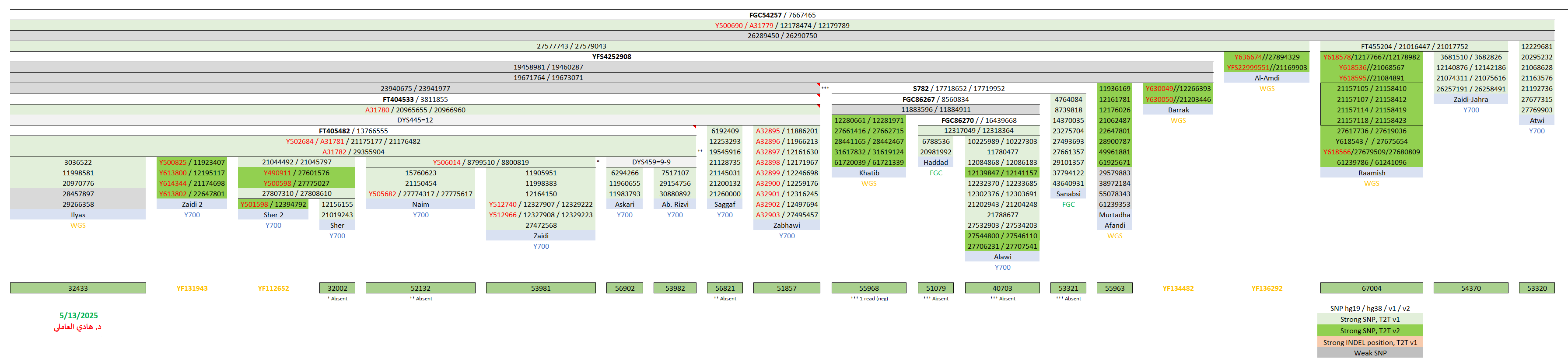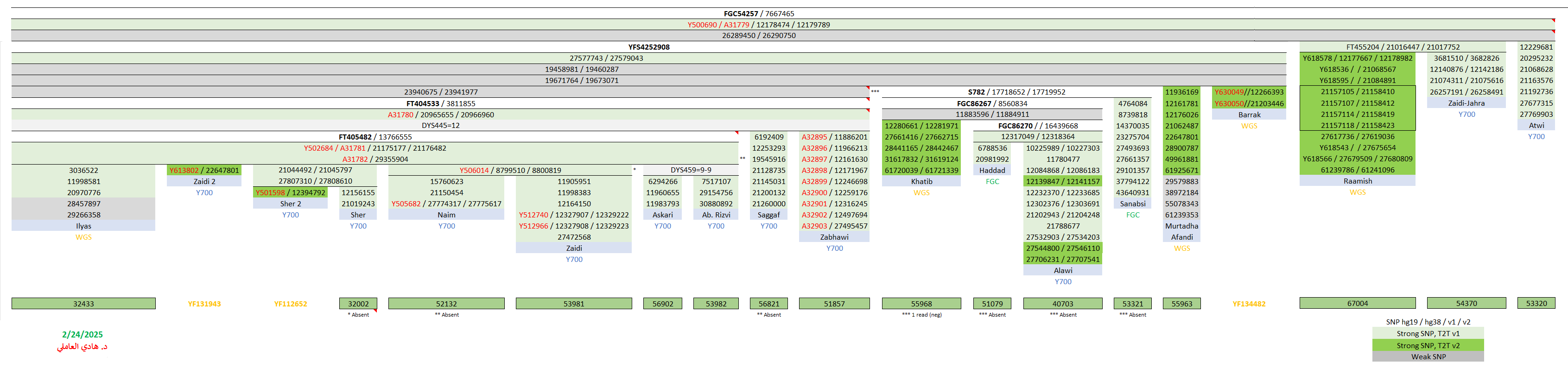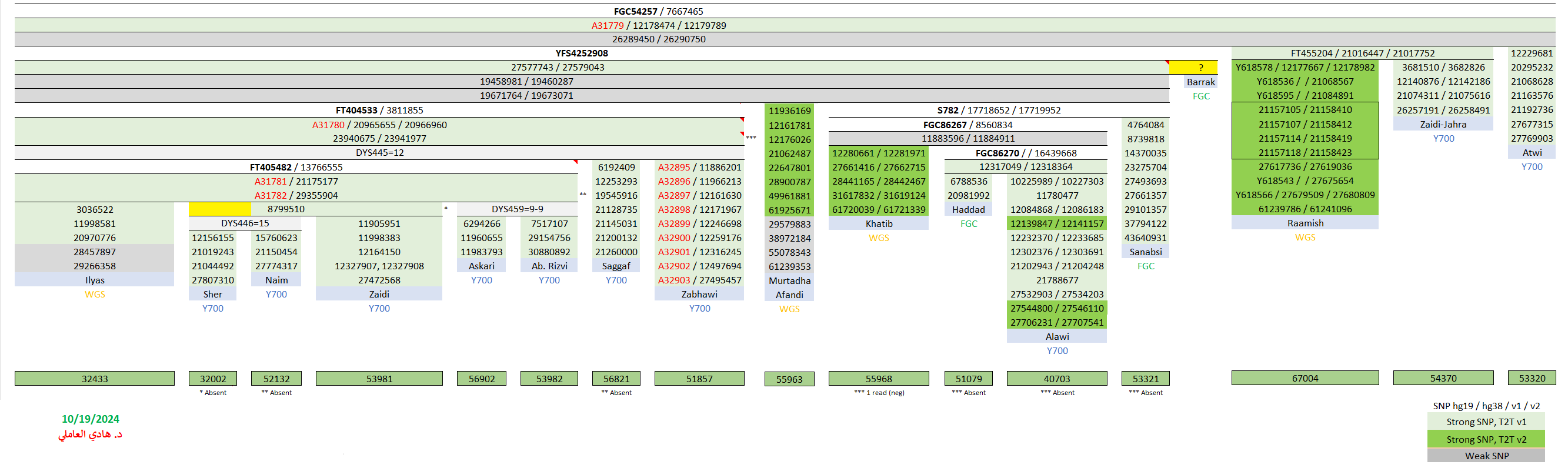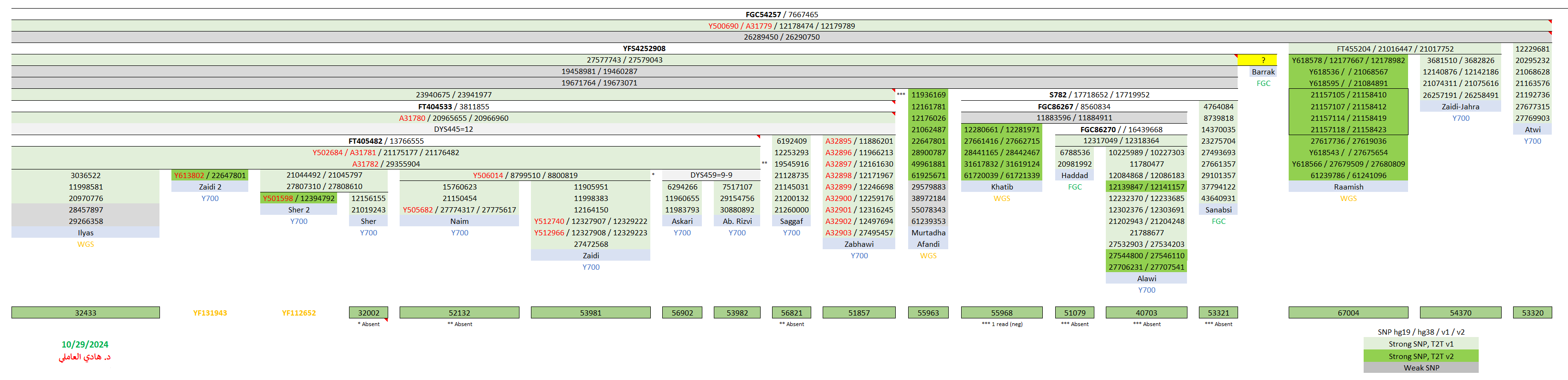 - مُتوقّعة موجبة للتحوّر الحُسيني الفرعي FGC54257 الجامع لها مع عيّنات زيود الجهراء وآل عطوي وعيّنات شرق الجزيرة العربيّة وجنوب العراق (اليصرة والحلّة) والشام (دمشق وجبل عامل) وشمال الهند.