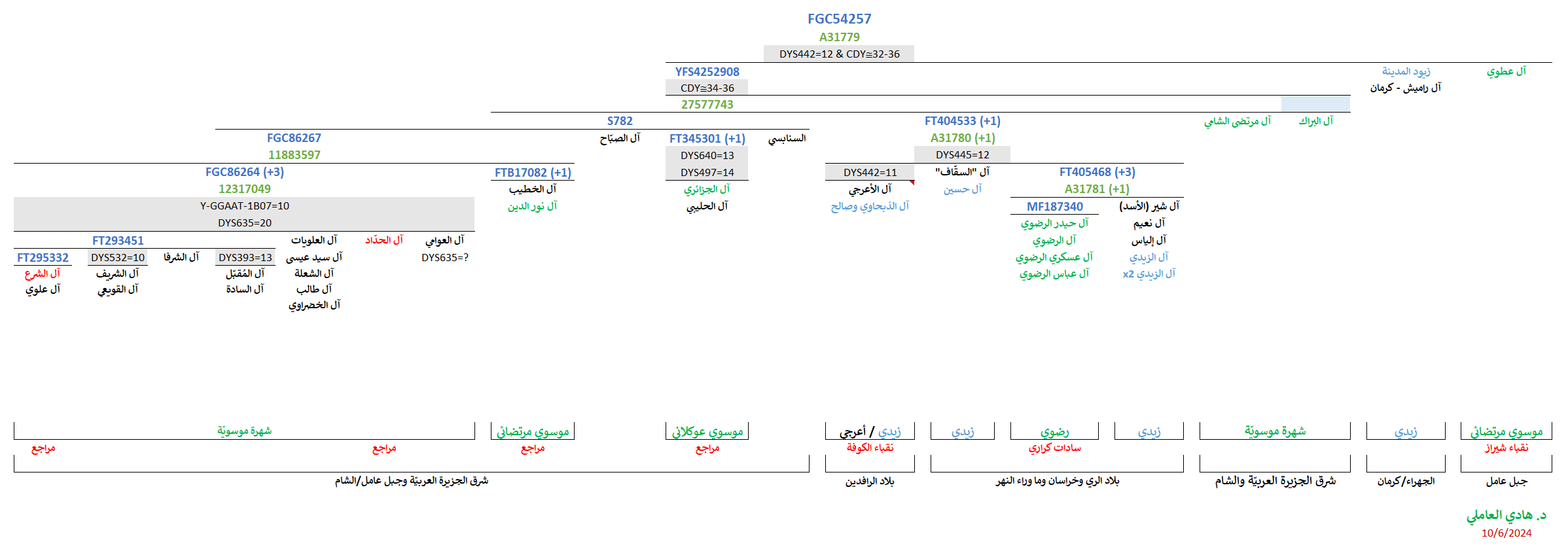 - موجبة للتحوّر المُتكرّر المُشترك (DYS445=12) المُلاصق للتحوّرين المُشتركين (FT404533 و FT406499) الجامعين لفروع السادة 1) آل عسكري وعبّاس وحيدر (“رضوي” Karari) وآل شير ونعيم وإلياس (Bihar) وسادات البارا آل الزيدي الأولى (Khairthal) والثانية/الرابعة (Muzaffarnagar) والسادة الندوي وآل الهندي و2) آل الذبحاوي و”الأعرجي” وصالح (الحلّة) و3) آل “السقّاف” وآل حسين الزيدي الترمذي وآل زيدي الثالثة. وهذه الفروع الثلاثة مُتمثلّة بذريّة السيّد أبي علي عُمر بن يحيى المُحدّث (بحسب ما بدا في قراءة نتيجة السادة العمدي من اليمن).