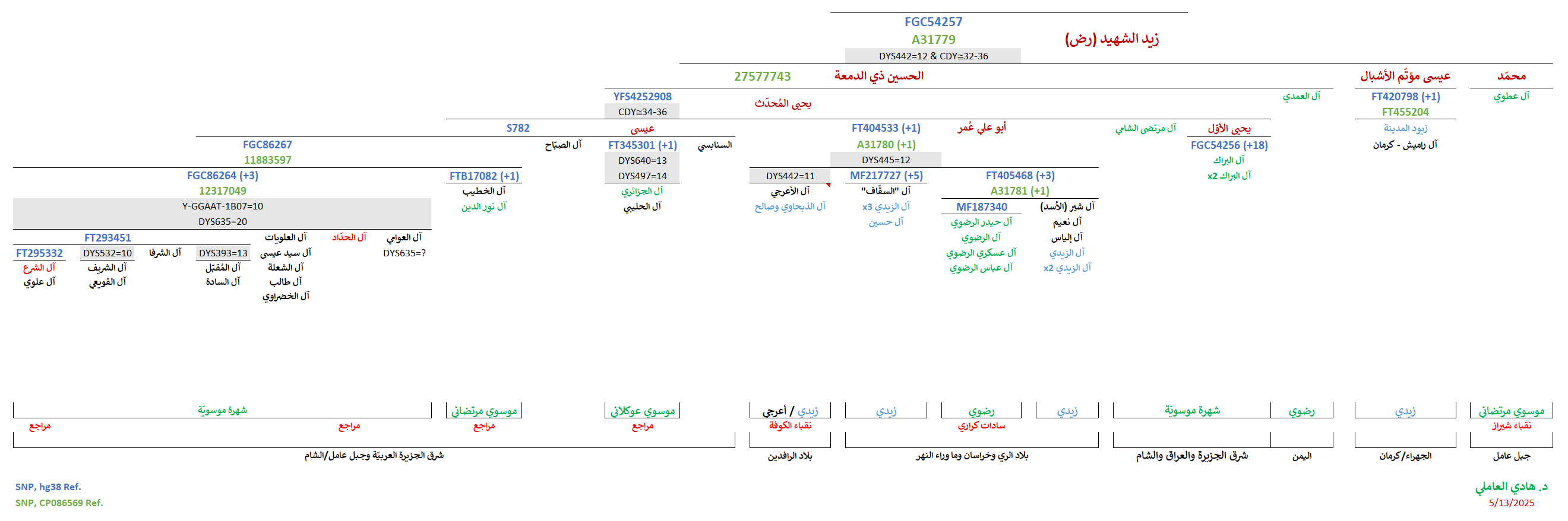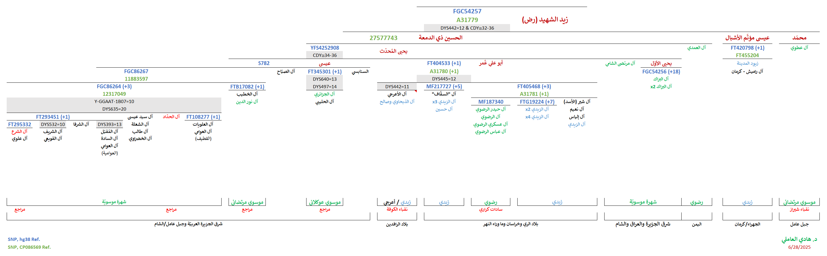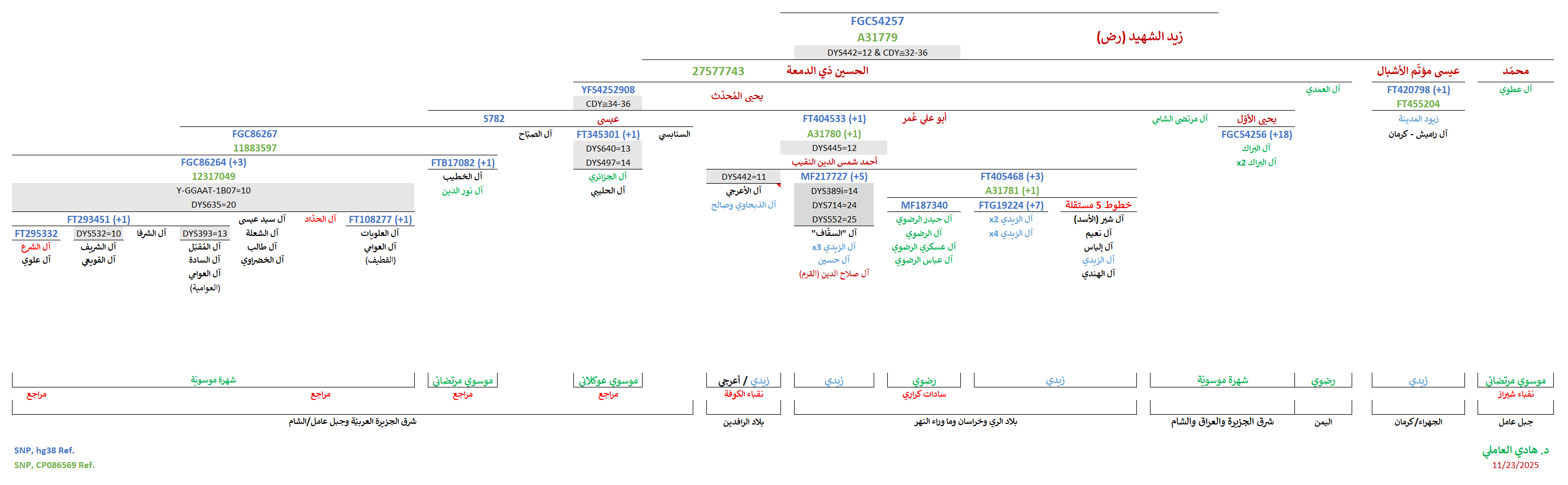 - موجبة للتحوّرات المُتكرّرة المُشتركة (CDY≅34-36) المُلاصقة للتحوّر المُشترك YFS4252908 الجامع لعيّنات شرق الجزيرة العربيّة وجنوب العراق والشام (دمشق وجبل عامل) وشمال الهند، والمُتمثّل بالسيّد يحيى المُحدّث بن الحسين ذي الدمعة بن زيد الشهيد (ع).