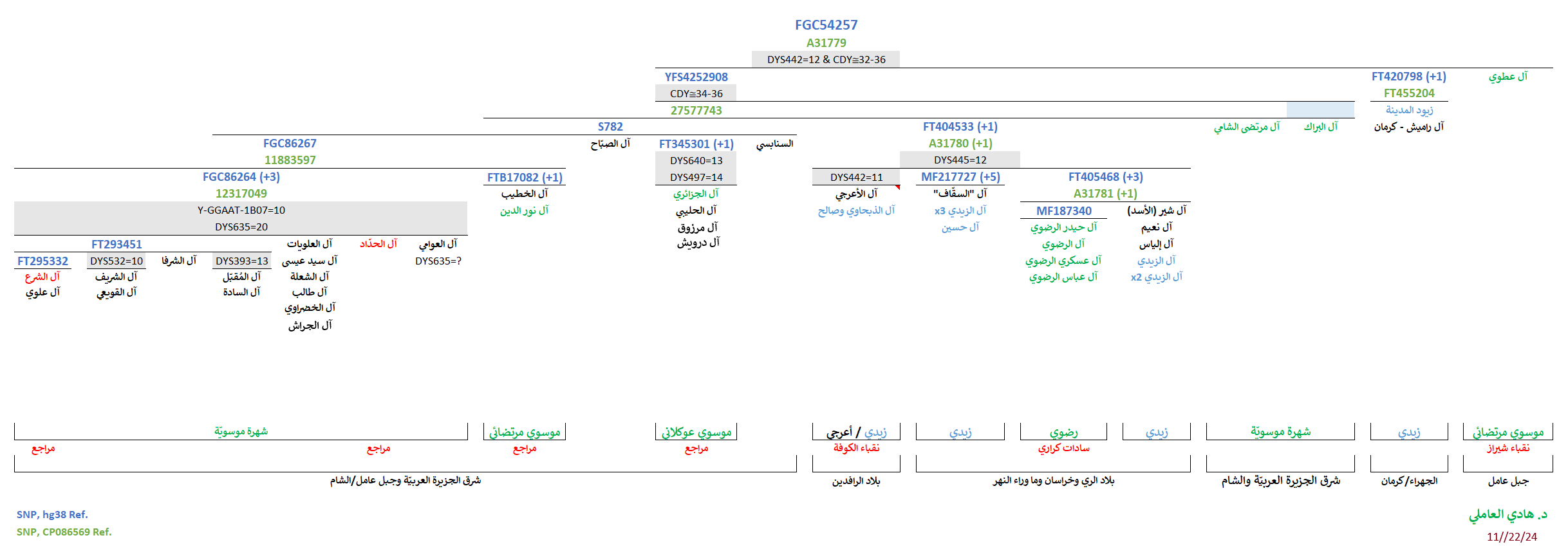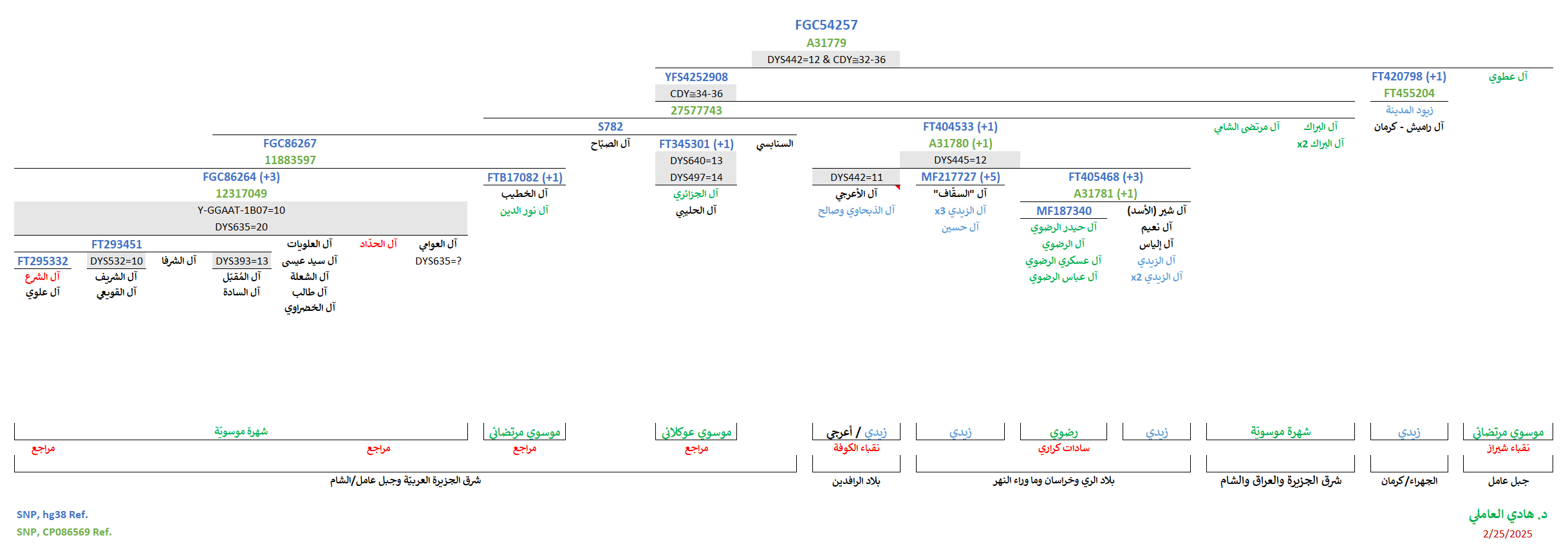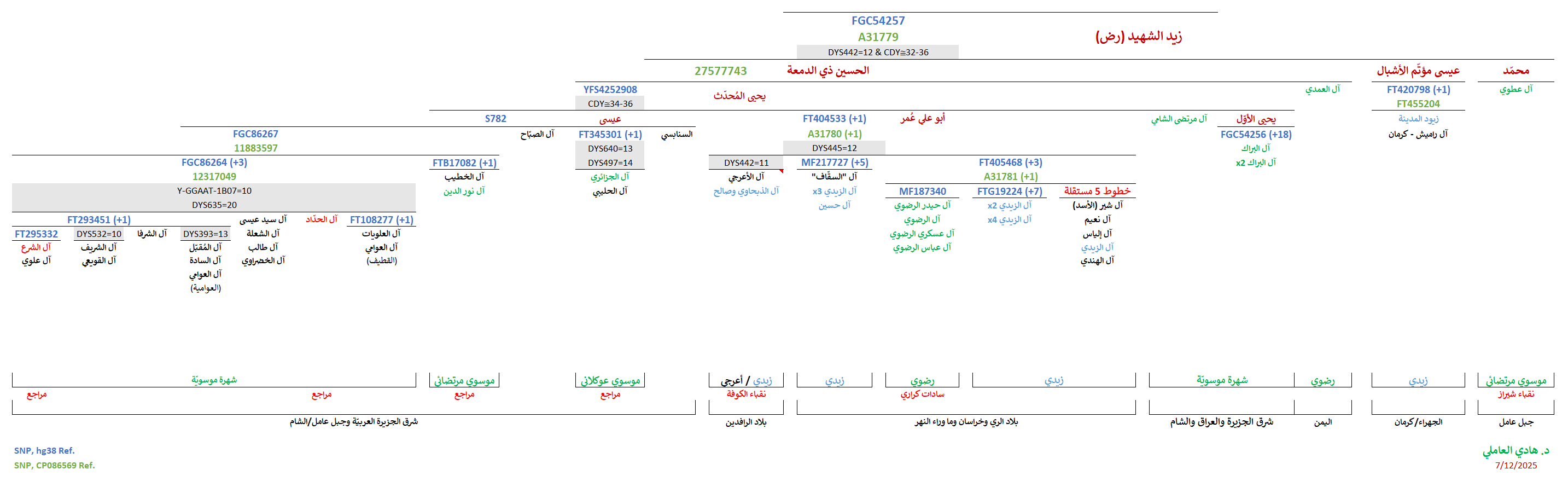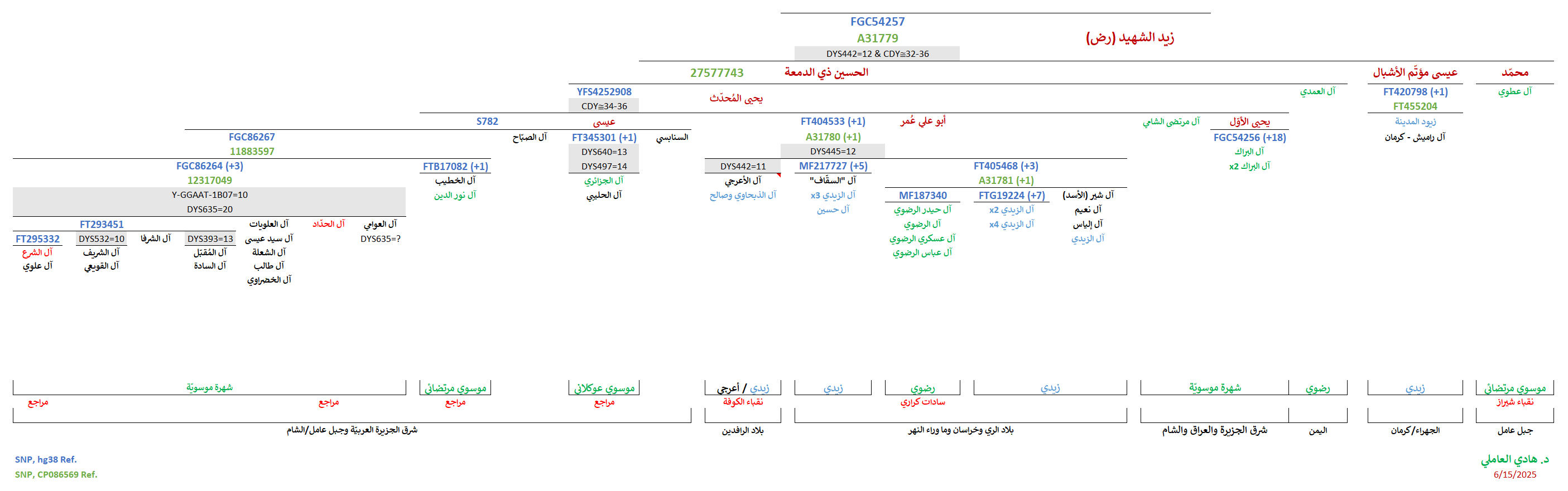 - موجبة للتحوّرات المُتكرّرة المُشتركة (CDY≅34-36) المُلاصقة للتحوّر المُشترك YFS4252908 الجامع لعيّنات شرق الجزيرة العربيّة وجنوب العراق والشام (دمشق وجبل عامل) وشمال الهند، والمُتمثّل بالسيّد يحيى المُحدّث بن الحسين ذي الدمعة بن زيد الشهيد (ع).