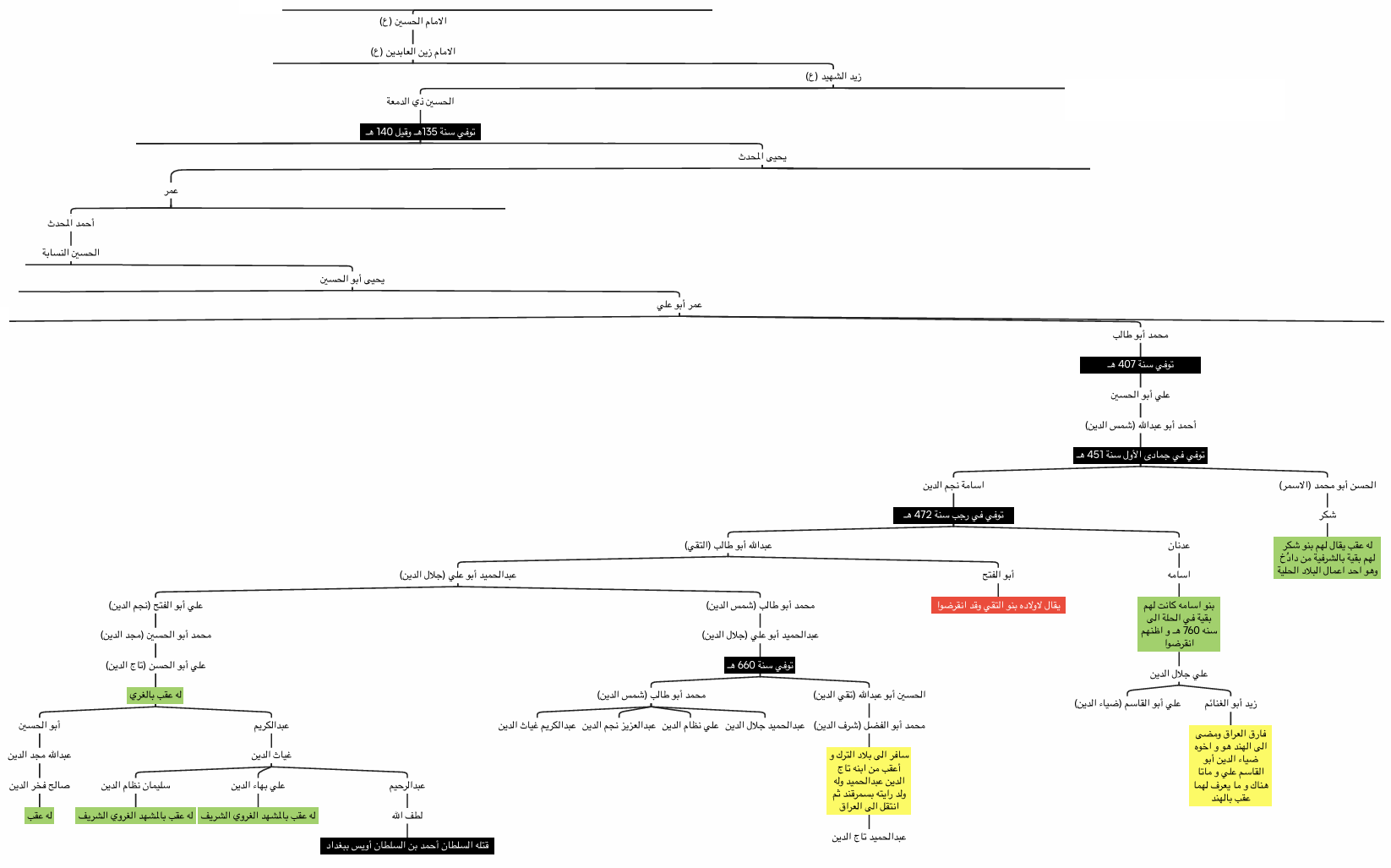 - الحسين بن أحمد المحدث بن أبي علي عمر بن يحيى بن الحسين ذي الدمعة بن زيد الشهيد (رض)، السيّد النسابة أول نقباء الطالبيّين ونقيب نقبائهم وصاحب فكرة إنشاء نقابة الطالبيّين المُباركة. أنشأ النقابة بعد انتقاله من المدينة إلى الكوفة عام 251 للهجرة الشريفة وتُوفّي عام 260 هج. وكان يُدعى مَن يتولّى أمر النقابة في العصر العبّاسي نقيب الطالبيين والعلويين، ثمّ دُعي في العصور المتأخرة نقيب الأشراف، وكانت مُهمّته حفظ النسب الشريف وحصر أعداد الطالبيّين ورعاية شؤونهم وأماكن سكنهم في مُختلف الحواضر الإسلاميّة. ومن مهامه أيضاً تعيين النقباء المحليّين في تلك الحواضر المُتباعدة.