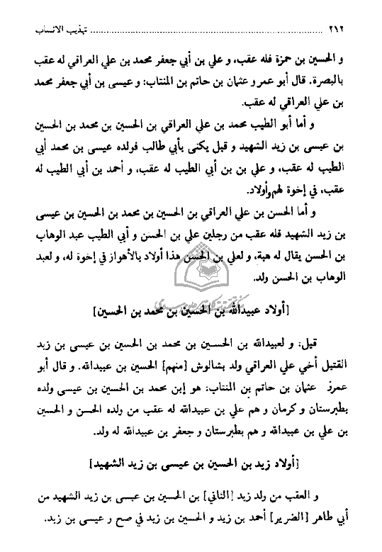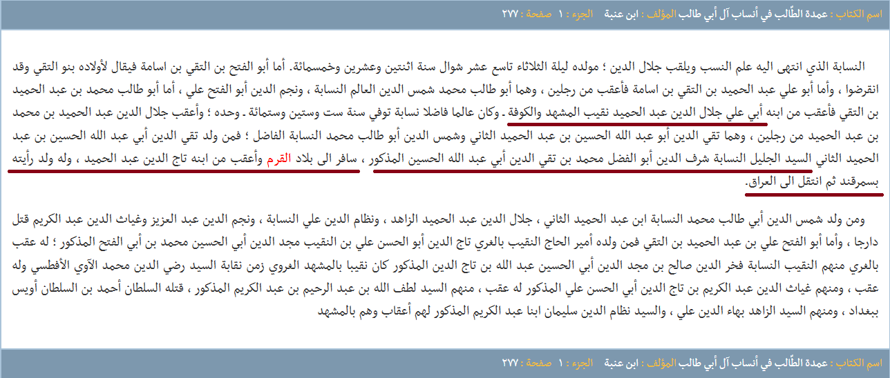 - الحسين بن أحمد المحدث بن أبي علي عمر بن يحيى بن الحسين ذي الدمعة بن زيد الشهيد (رض)، السيّد النسابة أول نقباء الطالبيّين ونقيب نقبائهم وصاحب فكرة إنشاء نقابة الطالبيّين المُباركة. أنشأ النقابة بعد انتقاله من المدينة إلى الكوفة عام 251 للهجرة الشريفة وتُوفّي عام 260 هج. وكان يُدعى مَن يتولّى أمر النقابة في العصر العبّاسي نقيب الطالبيين والعلويين، ثمّ دُعي في العصور المتأخرة نقيب الأشراف، وكانت مُهمّته حفظ النسب الشريف وحصر أعداد الطالبيّين ورعاية شؤونهم وأماكن سكنهم في مُختلف الحواضر الإسلاميّة. ومن مهامه أيضاً تعيين النقباء المحليّين في تلك الحواضر المُتباعدة.