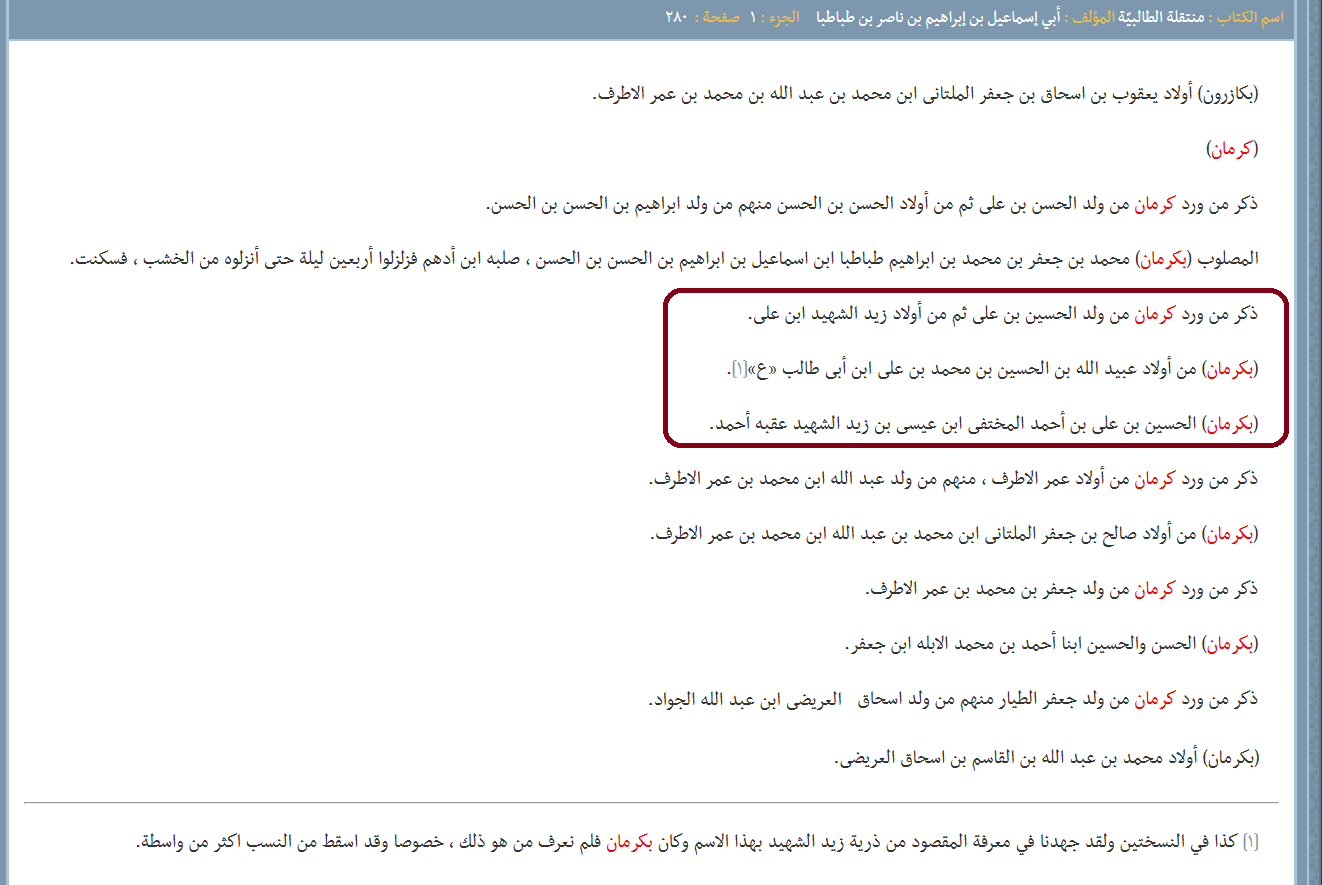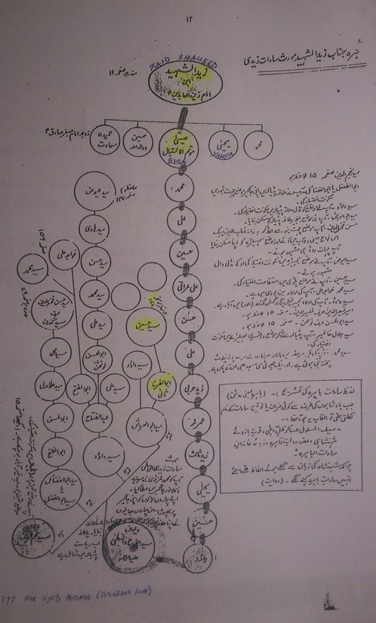 وينتهي نسب السادة آل زيدي الترمذي -العيّنة الثالثة- وبني عمومتهم آل حسين الزيدي إلى جدّهم السيّد حسن نهتوري بن ضياء الدين بن حسن عسكري بن محمود الترمذي الذي ينتهي موروثه إلى السيد أبي عبدالله الحسين النسابة (نقيب نقباء الطالبيّين في العهد العبّاسي) بن أحمد المحدث بن أبي علي عمر بن أبي الحسن يحيى المحدث بن الحسين ذي الدمعة بن الفقيه زيد الشهيد بن الإمام علي زين العابدين (عليه السلام). وقد تمّ جمع هذا العامود النسبي حديثاً وتشوبه بعض الأخطاء بين الجدّ محمود الترمذي والحسين النسّابة (نقيب النقباء). بالمقابل، نجد أنّ هذا الخطّ مُنفصل في جدّ أعلى عن خط السيّد أبو الفرح الواسطي (أو أبو الفرج، الجدّ الجامع لكافّة السادة الزيديّة في باكستان والهند المعروفين بسادات البارا، والمُعقّب من 12 ولداً والمُنتقل من واسط إلى الشمال الهندي عبر بلاد الريّ وخراسان، حيث حصل على ضياع في إقليم البنجاب، وتسلّم هو وأحفاده رئاسة بلدة بارا في مظفرنجار). ولا نجد ذِكر لهجرة زيديّة طالبيّة إلى خُراسان الكُبرى في كتاب المُنتقلة، وهي جغرافيا تُعتبر همزة وصل لهجرات ما وراء النهر وصولاً إلى الشمال الهندي والكشميري. إلّا أنّنا نجد أنّ العلّامة السيّد جمال الدين ابن عنبة الحسني قد ذكر في “عمدته” الخطوط الزيديّة من ذريّة الحسين النسّابة النقيب التي انتقلت إلى الهند وسمرقند والقرم. وهذا مُشجّر يوضح أبرز فروعهم المغادرة لموطنها الأصلي في المشهد الغروي (مرقد أمير المؤمنين عليه السلام) والكوفة، وهم جميعاً ذريّة السيد النسّابة أحمد شمس الدين العُمري الزيدي: