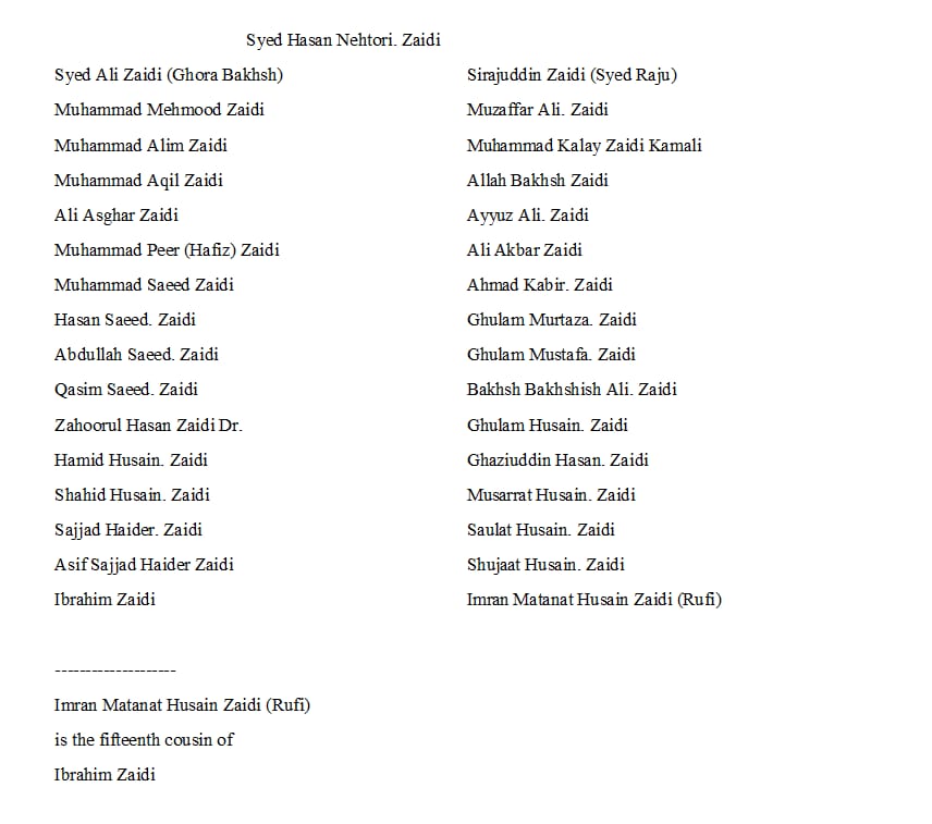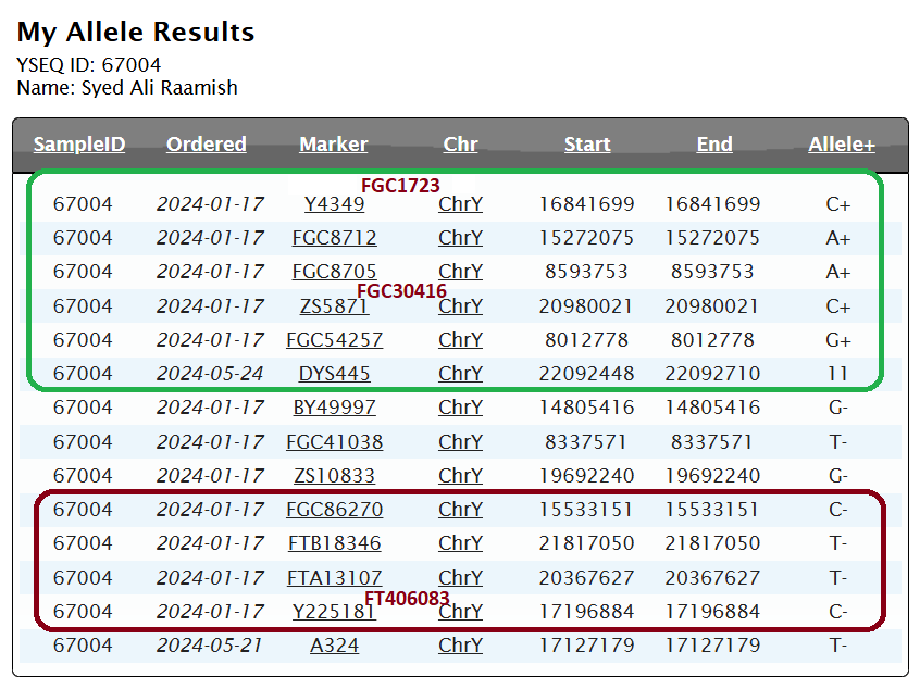 - سالبة للتحوّرات المُشتركة المُتكرّرة الثلاث (DYS389i=14 و DYS714=24 و DYS552=25) المُلاصقة للتحوّرات المُشتركة الستّ (إحداها FTA10143) الجامعة لآل “السقّاف” (من ذوي الأصول الهنديّة والهجرة المكيّة العكسيّة) وآل حسين الزيدي وآل زيدي -العيّنة الثالثة- (من كيتهال الهنديّة وهم من ذوي الأصول الترمذيّة الخراسانيّة).