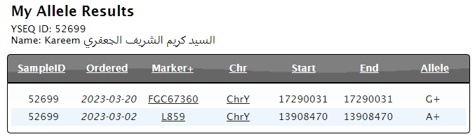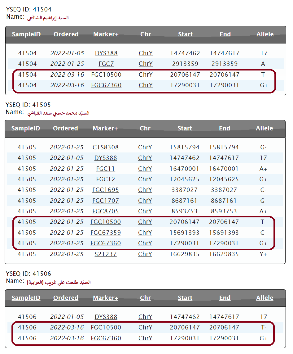 ملاحظة: يُعتبر نسب السادة آل الشريف الشيمي “الثعالبة” من أقوى المواريث الجعفريّة لدينا في المشروع، وعليه سيتمّ تحديد عدّة خطوط جعفريّة جينيّة. لذلك تمّ تطوير هذه العيّنة إلى Y700 لكي نستخرج التحورات المشتركة بينها وبين إحدى هذه الخطوط الأربعة الجينيّة.