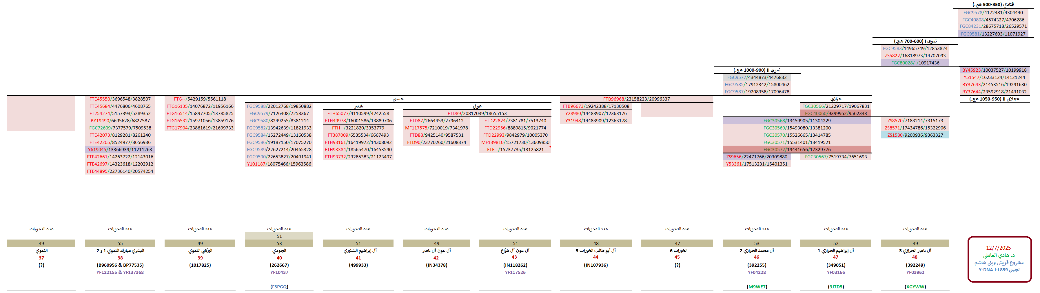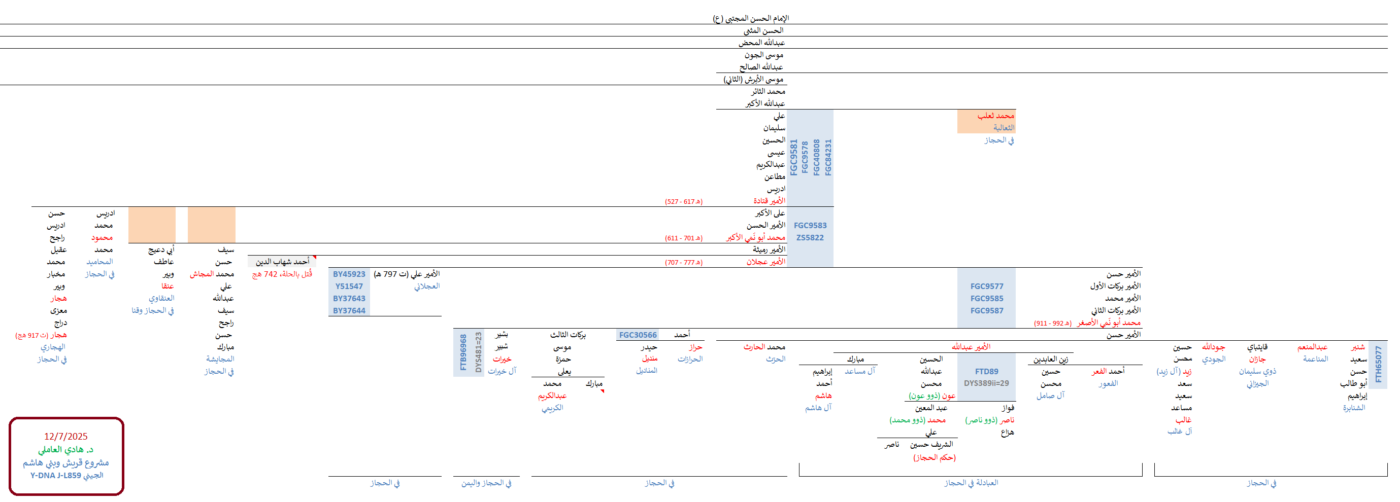 مواضيع مُتعلّقة: نتيجة الأشراف آل سليمان الجيزاني النمويّين ، نتيجة Y700 لآل هزّاع آل عون العبادلة ، نتيجة ثالثة للأشراف آل عون العبادلة ، نتيجة الأشراف آل عون العبادلة Y700 ، عيّنات الأشراف العبادلة ، نتيجة الأشراف آل هاشم العبادلة ، نتيجة الأشراف آل صامل العبادلة ، نتيجة الأشراف الفعور العبادلة ، نتيجة خامسة لآل أبو طالب الخيراتي Y700 ، نتيجة رابعة لآل أبو عقيل الخيراتي ، عينة الأشراف آل علي خيرات ، تحديث نتيجة آل خيرات ، تحديث مُشجّر الحرّازت الجيني ، الفصل الجيني في المُعقّبين من آل قتادة ، نتيجة السادة آل أبو طالب القتادات Y700 ، نتيجة Y700 للأشراف النمويّين القتادات ، نتيجة Y700 للأشراف العنقاويّة القتادات ، 8 عيّنات للسادة العنقاويّة القتادات الحسنيّين ، نتيجة الأشراف آل فِنْدي العنقاوية ، تحديث نتيجة الأشراف المجايشة ، نتيجتيّ Y700 للأشراف الهجاري ، تحديث نتائج السادة القتادات ، مُشجّر الأشراف العجالين الجيني ، عيّنات الأشراف آل حسن العجالين Y700 ، شواهد بني محمد الثائر في مكة ، التحور الحسني المحضي الموسوي ، STR النموي ، شواهد بني محمد الثائر في مكة ، ساحل اللآلئ الحسنيّة الموسوية