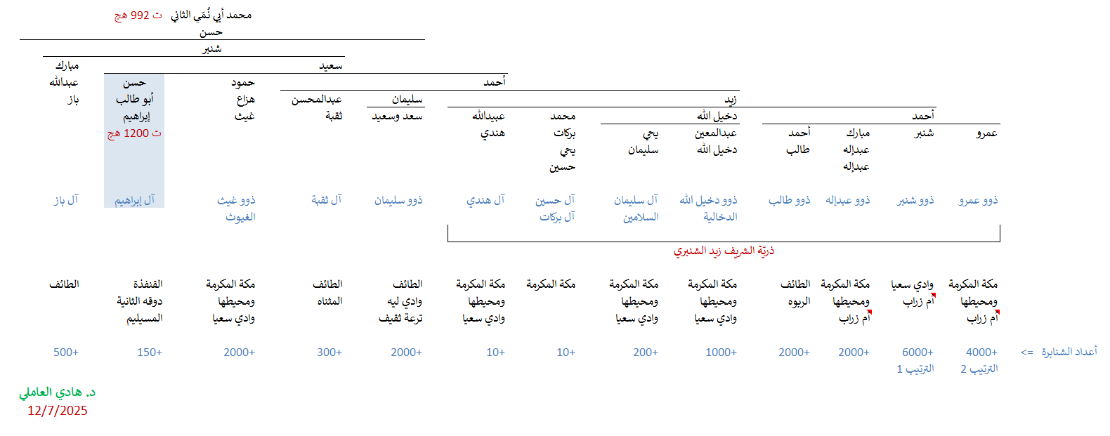 وهذا مُشجّر جينو-تراثي يوضح فرعهم بين أعمدة نسب باقي الأشراف النمويّين والقتادات الموجودة في المشروع: