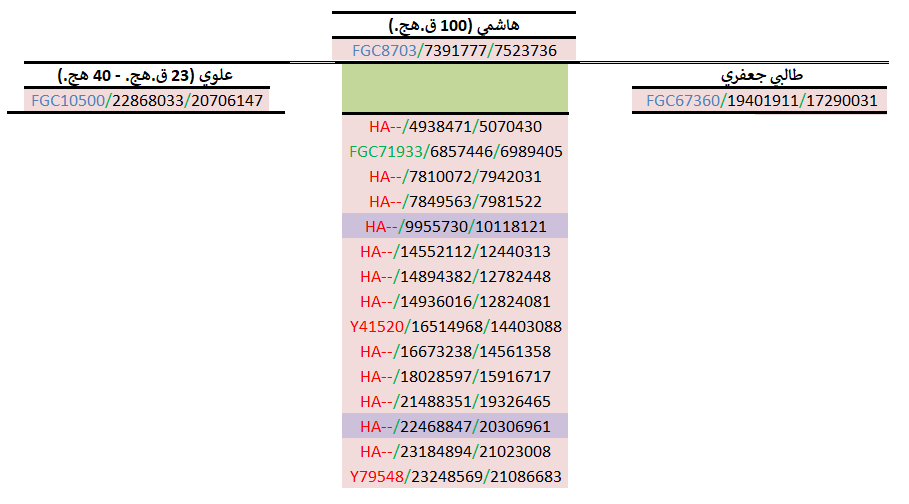 مواضيع مُتعلّقة: نتيجة الأشراف آل سليمان الجيزاني النمويّين ، نتيجة Y700 لآل هزّاع آل عون العبادلة ، نتيجة ثالثة للأشراف آل عون العبادلة ، نتيجة الأشراف آل عون العبادلة Y700 ، عيّنات الأشراف العبادلة ، نتيجة الأشراف آل هاشم العبادلة ، نتيجة الأشراف آل صامل العبادلة ، نتيجة الأشراف الفعور العبادلة ، نتيجة خامسة لآل أبو طالب الخيراتي Y700 ، نتيجة رابعة لآل أبو عقيل الخيراتي ، عينة الأشراف آل علي خيرات ، تحديث نتيجة آل خيرات ، تحديث مُشجّر الحرّازت الجيني ، الفصل الجيني في المُعقّبين من آل قتادة ، نتيجة السادة آل أبو طالب القتادات Y700 ، نتيجة Y700 للأشراف النمويّين القتادات ، نتيجة Y700 للأشراف العنقاويّة القتادات ، 8 عيّنات للسادة العنقاويّة القتادات الحسنيّين ، نتيجة الأشراف آل فِنْدي العنقاوية ، تحديث نتيجة الأشراف المجايشة ، نتيجتيّ Y700 للأشراف الهجاري ، تحديث نتائج السادة القتادات ، مُشجّر الأشراف العجالين الجيني ، عيّنات الأشراف آل حسن العجالين Y700 ، شواهد بني محمد الثائر في مكة ، التحور الحسني المحضي الموسوي ، STR النموي ، شواهد بني محمد الثائر في مكة ، ساحل اللآلئ الحسنيّة الموسوية