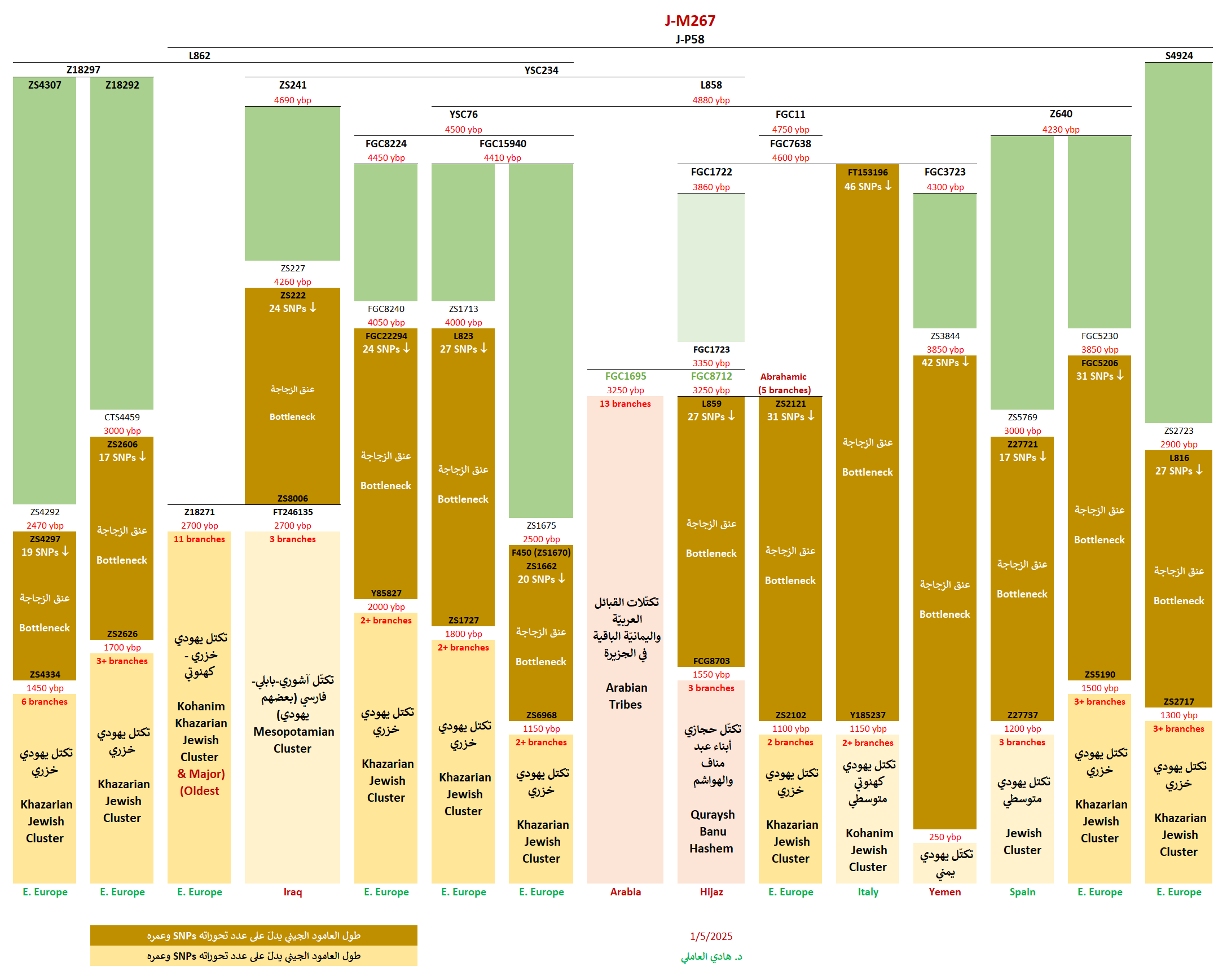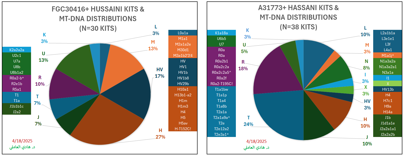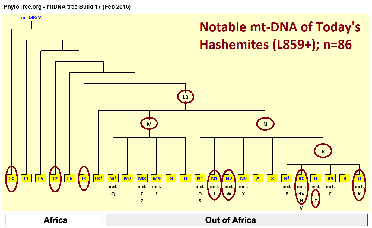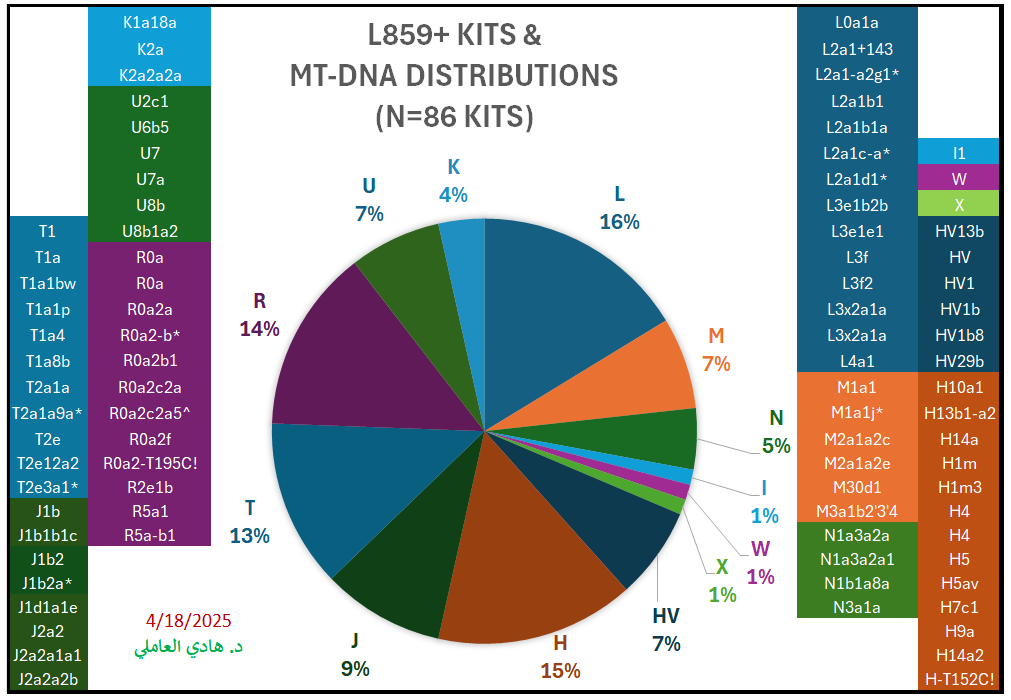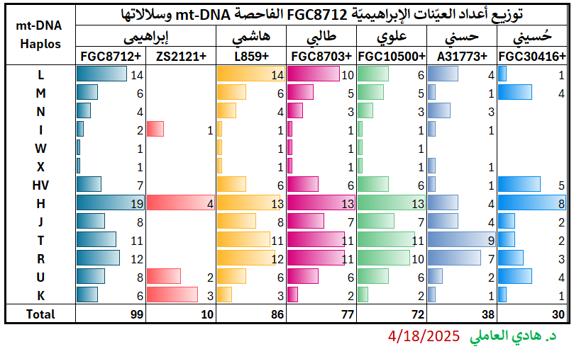 إستكمالاً لبحثنا الجيني المُعمّق حول قبيلة قريش والسادة الهواشم والطالبيّين من حَمَلة الطفرة الجينيّة الذكوريّة L859، تمّ مسح حوالي 100 عيّنة لهم ولبني عمومتهم من أبناء السلالة الإبراهيميّة (FGC8712) فاحصة لشريط الأمّهات الميتوكوندري الدائري mitochondrial-DNA (الذي يتوارثونه أُمّاً عن أُمّ وجيلاً بعد جيل إلى أن ينقطع بوصوله إلى الذكور منهم ويُكمل إمتداده عند إناثهم)، وأسفرت نتائجهم أنهم على سلالات أنثويّة شتّى يزيد تعدادها عن 90 فرع جيني تفصيلي (مع إشتراك القليل منهم في نفس الفرع).