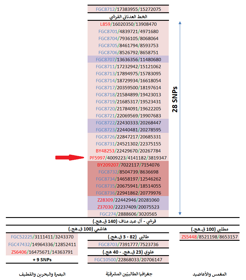 مواضيع مُتعلّقة: الطالبيّات والهاشميّات من أمّهات الطالبيّين ، تعداد الطالبيّين والهواشم بين الماضي والحاضر ، حجم قريش السكاني وعمليّة تكوينها ، جغرافيا بني هاشم المشرقيّة ، إحصائيات المشروع Project Statistics ، تحديث إحصائيّات المشروع ، تحديث المُشجّر الجيني ، الجينات تتكلّم: الكويت وباديتها ، الجينات تتكلّم: مصر المحروسة وصعيدها ، الجينات تتكلّم: البحرين والقطيف والأحساء ، تعداد الطالبيّين والهواشم بين الماضي والحاضر ، تحديث مشجّر عيّنات المشروع الجينوغرافي ، نقوش ومُشجرات الهواشم الأوائل ومُحبّيهم ، نقوش ومُشجرات الهواشم الأوائل ومُحبّيهم ، منتقلة الفروع السجّاديّة (الباهر والأشرف والأفطس) ، منتقلة الجعفريّين الحُسينيّين ، منتقلة السادة الموسويّة ، منتقلة الزيديّة وهيكليّتهم الجينيّة ، منتقلة ذريّة الحسين الأصغر وهيكليّتهم الجينيّة ، منتقلة السادة المحضيّين الحسنيّين ، منتقلة ذريّة إبراهيم الغَمْر (الطباطبائيّة والرسيّة وغيرهم) ، منتقلة الحسنيّين (الحسن وجعفر وداوُد وزيد) ، منتقلة العبّاسيّين العلويّين ، منتقلة العقيليّين والحنفيّين ، منتقلة الجعافرة الطالبيّين ، مشاهد ومشاعر مكّة المُكرّمة ، مشاهد ومزارات المدينة المُنوّرة ، مشاهد ومزارات الكوفة والنجف الأشرف ، المعقبون من آل عبدالمطلب – فروع نادرة ، تحديث تكتّلات FGC8712 الجرمانيّة والخزريّة