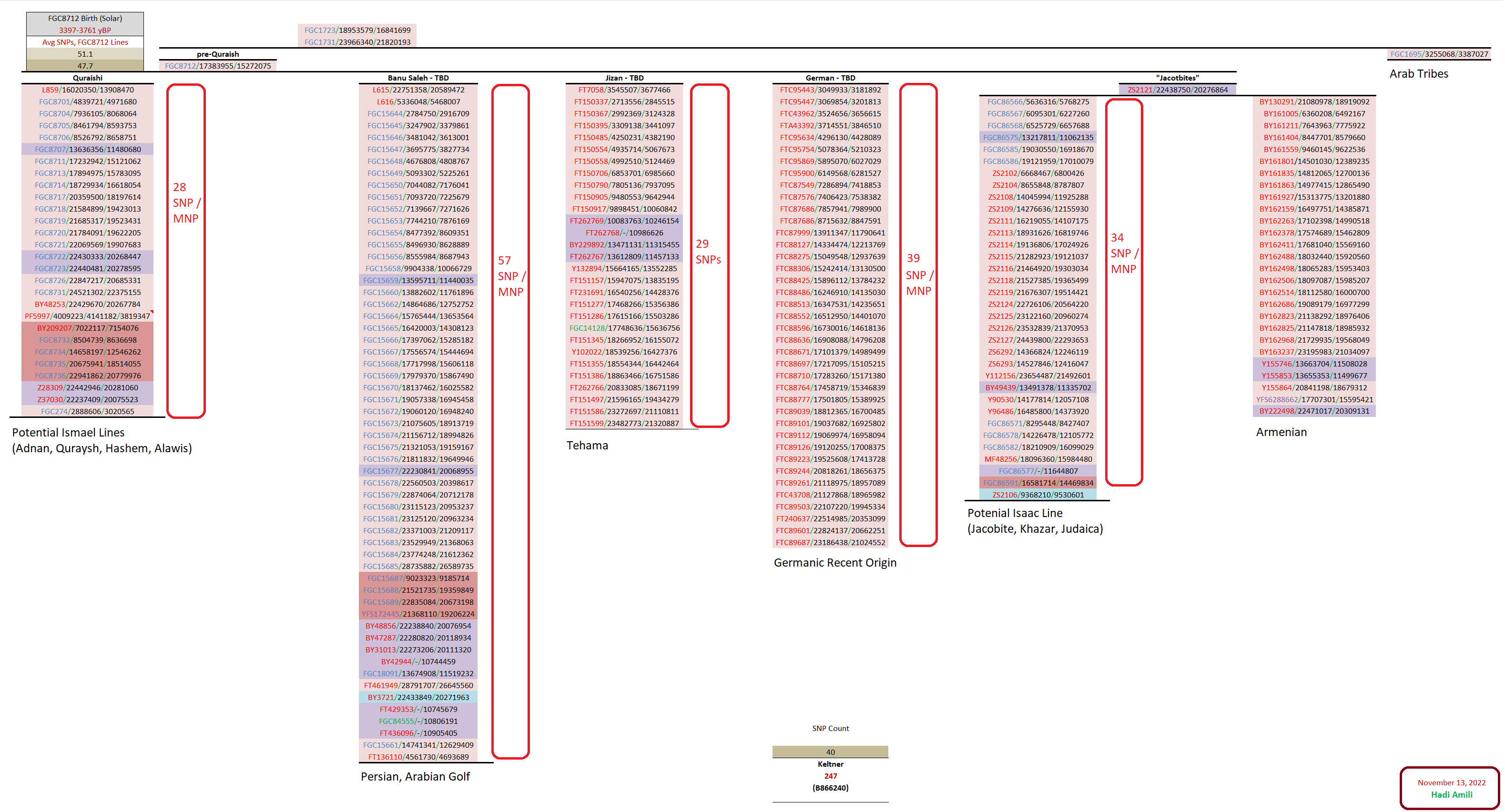 إستكمالاً لبحثنا الجيني المُعمّق حول قبيلة قريش والسادة الهواشم والطالبيّين من حَمَلة الطفرة الجينيّة الذكوريّة L859، تمّ مسح حوالي 100 عيّنة لهم ولبني عمومتهم من أبناء السلالة الإبراهيميّة (FGC8712) فاحصة لشريط الأمّهات الميتوكوندري الدائري mitochondrial-DNA (الذي يتوارثونه أُمّاً عن أُمّ وجيلاً بعد جيل إلى أن ينقطع بوصوله إلى الذكور منهم ويُكمل إمتداده عند إناثهم)، وأسفرت نتائجهم أنهم على سلالات أنثويّة شتّى يزيد تعدادها عن 90 فرع جيني تفصيلي (مع إشتراك القليل منهم في نفس الفرع).