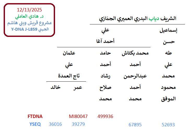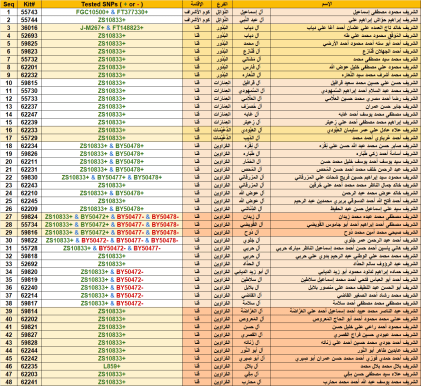 ظهرت نتيجة Y700/111-STRs لعيّنة السادة آل تاج العمدة آل دياب البدور العُمير الجمامزة المهنّا الأعرجيّة الحُسينيّين من قرية الأشراف في محافظة قِنا جنوب الصعيد المصري –والأصل التاريخي من المدينة النبويّة مع عودة عكسيّة لبعض فروعهم من الصعيد إليها–، وجاءت موجبة للتحوّرات القرشيّة الهاشميّة (DYS485=14 و L859) والطالبيّة (FGC8703) والعلويّة العامّة (FGC10500 & DYS513=11) والحُسينيّة (FGC30416). مبارك لهم.