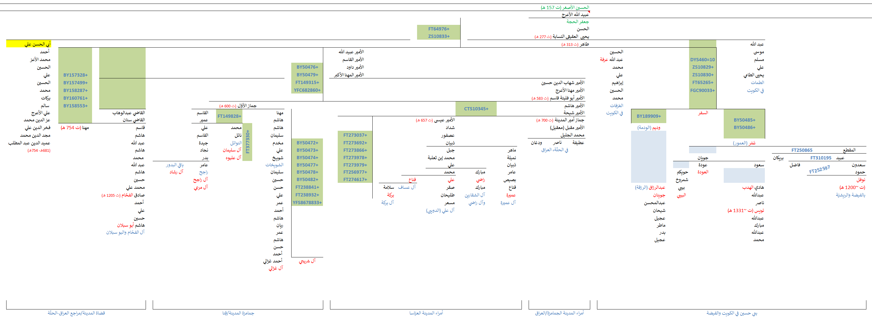 - موجبة للتحوّرات الأعرجيّة العقيقيّة (ZS10833 و FT64976 و DYS442=13) الجامعة للسادة آل مهنّا (بفروعهم المتعددة من الجمامزة والعيّاسا وباقي أولاد شيحة في المدينة والوجه وقِنا والجهراء) وقضاة المدينة المنتقلين إلى الحِلّة (آل الفحّام وآل شُبّر) والعَرَفات وباقي فروع بني حسين البادية (الطمات ومنهم العمور والودمة).