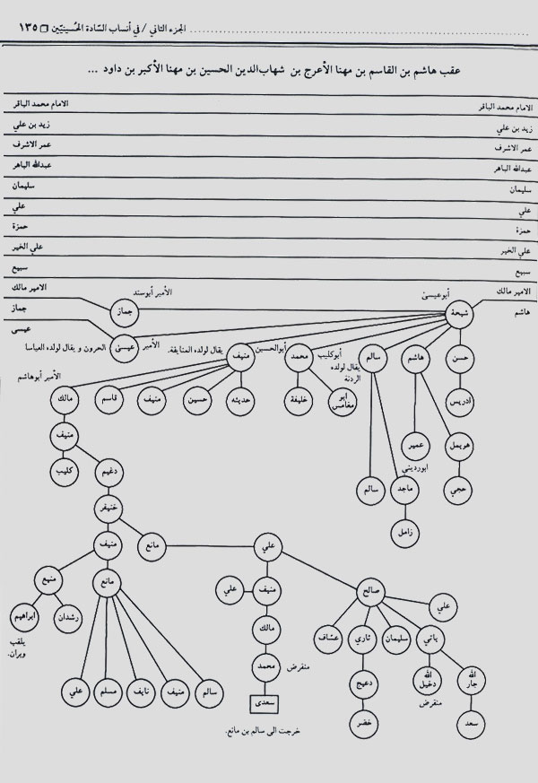وينتهي نسب أصحاب العيّنات ال13 جميعاً إلى السيّد عامر بن بدر (وله النسبة) بن نجاد بن جيدة بن القاسم بن علي بن عمير (الجدّ الجامع لهم مع السادة النوائل) بن القاسم بن جمال الدين جمّاز الأوّل (أمير المدينة المنوّرة 583-600 هـ) بن عزالدين القاسم (أبو فليتة) بن مهنـا بن شهاب الدين الحسين بن مهنا الأكبر بن داود بن القاسم بن عبيد الله بن طاهر بن يحيى النسّابة بن الحسن بن جعفر بن عبيد الله الأعرج بن الحسين الأصغـر (وإليه ترجع نسبة بني حسين) بن الإمام علي زين العابدين بن الإمام الحسين السبط عليهم السلام. وهذا مُشجّر يوضح أعمدة أنسابهم تحت السيّد بدر الجمّازي: