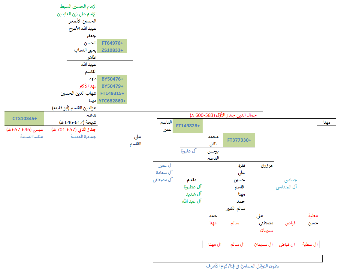 مواضيع مُتعلّقة: نتيجة آل راجح الجمامزة Y700 ، تحديث عيّنة آل مرعي الجمامزة ، 12 عيّنة للسادة النوائل الجمامزة الأعرجيّة ، نتيجة السادة النوائل الجمامزة Y700 ، نتيجة السادة آل عليوة الجمازي Y700 ، نتيجة Y700 للسادة آل خضران الشريف ، نتيجة السادة الخدعان الحُسيني Y700 ، نتيجة السادة آل عميرة ، نتيجة آل بركة العيّاسا Y700 ، نتيجة آل شقيران العيّاسا ، نتيجة السادة آل الجمّاز Y700 ، نتيجة آل شربجي الجمامزة Y700 ، نتيجة السادة آل غزالي Y700 ، نتيجة السادة آل شُبّر الحسيني Y700 ، نتيجة السادة الفحّام BigY ، نتيجة السادة العرفات Y700 ، نتيجة Y700 للسادة آل الحُسيني ، الDNA أصدقُ إنباءً من الكُتبِ ، السادة الأعرجيّة وتاريخ المدينة الضائع ، نقش أولاد طاهر في المدينة ، Güemes = جمّاز؟
