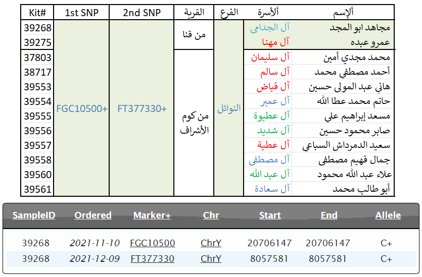 ظهرت نتائج 13 عيّنة من فروع متنوّعة للسادة البدور وآل راجح الجمامزة الأعرجيّة الحُسينيّين من مدينة قِنا الصعيديّة –والأصل من المدينة المنوّرة مع عودة بعض فروعهم إليها بهجرة عكسيّة عبر طريق القصير-الوجه البحري-، وهي فاحصة لدى YSEQ وموجبة جميعها لتحوّر الإمام علي (ع) FGC10500 أو التحوّر الطاهري العقيقي ZS10833. مبارك لهم.