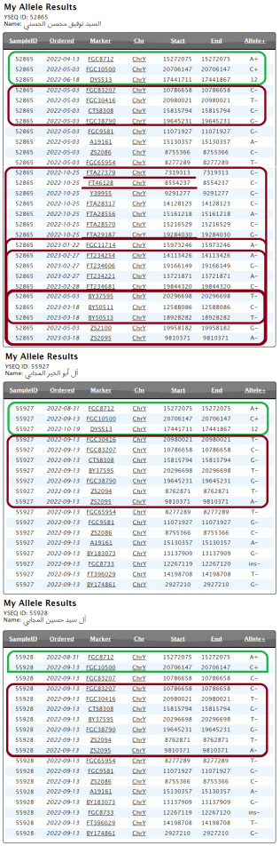 - أبناء إسماعيل الديباج (من الرسيّين والتجيّين CTS8303) والحسن المثلّث وزيد الأبلج FGC11714 –بتكتّلاتهم الجينيّة الواضحة-.