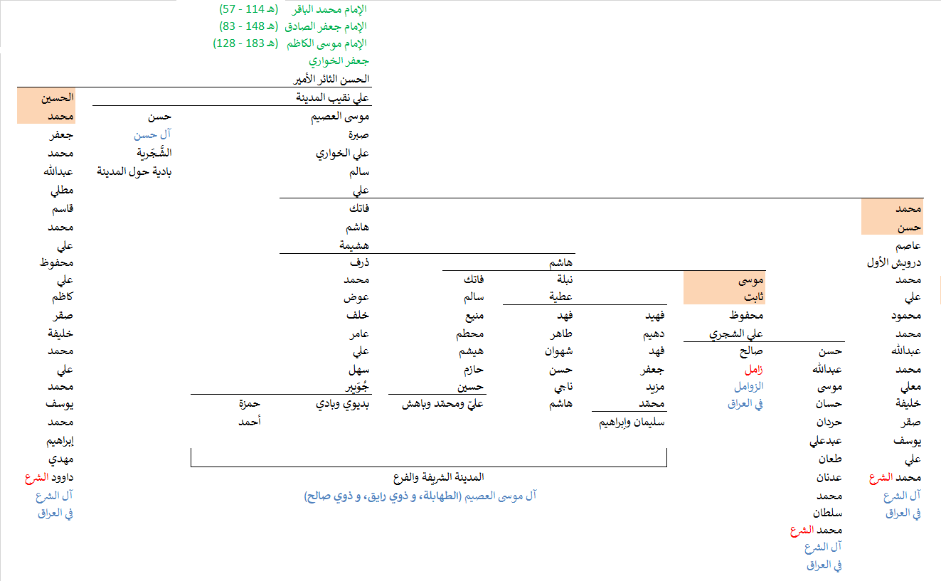- الهدف من هذه الفقرة تصحيح الأخطاء الواردة في كُتب الأنساب المُتأخرة عبر ضبطها جينيّاً وجغرافيّاً وربطها بشخصيات علويّة شهيرة قدر الإمكان، دون الطعن بالمواريث، وعبر تقديم العامود البديل المنطقي المطابق لهذه التكتّلات الجينيّة الواضحة.