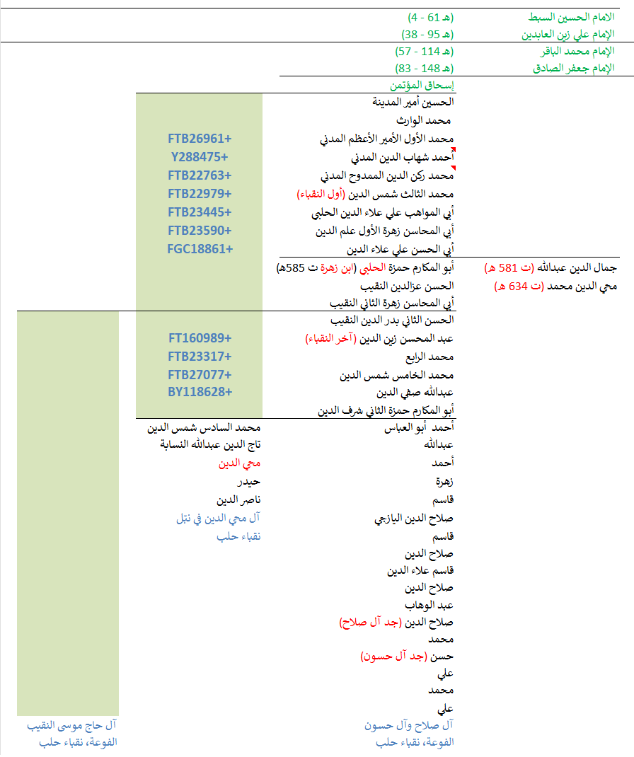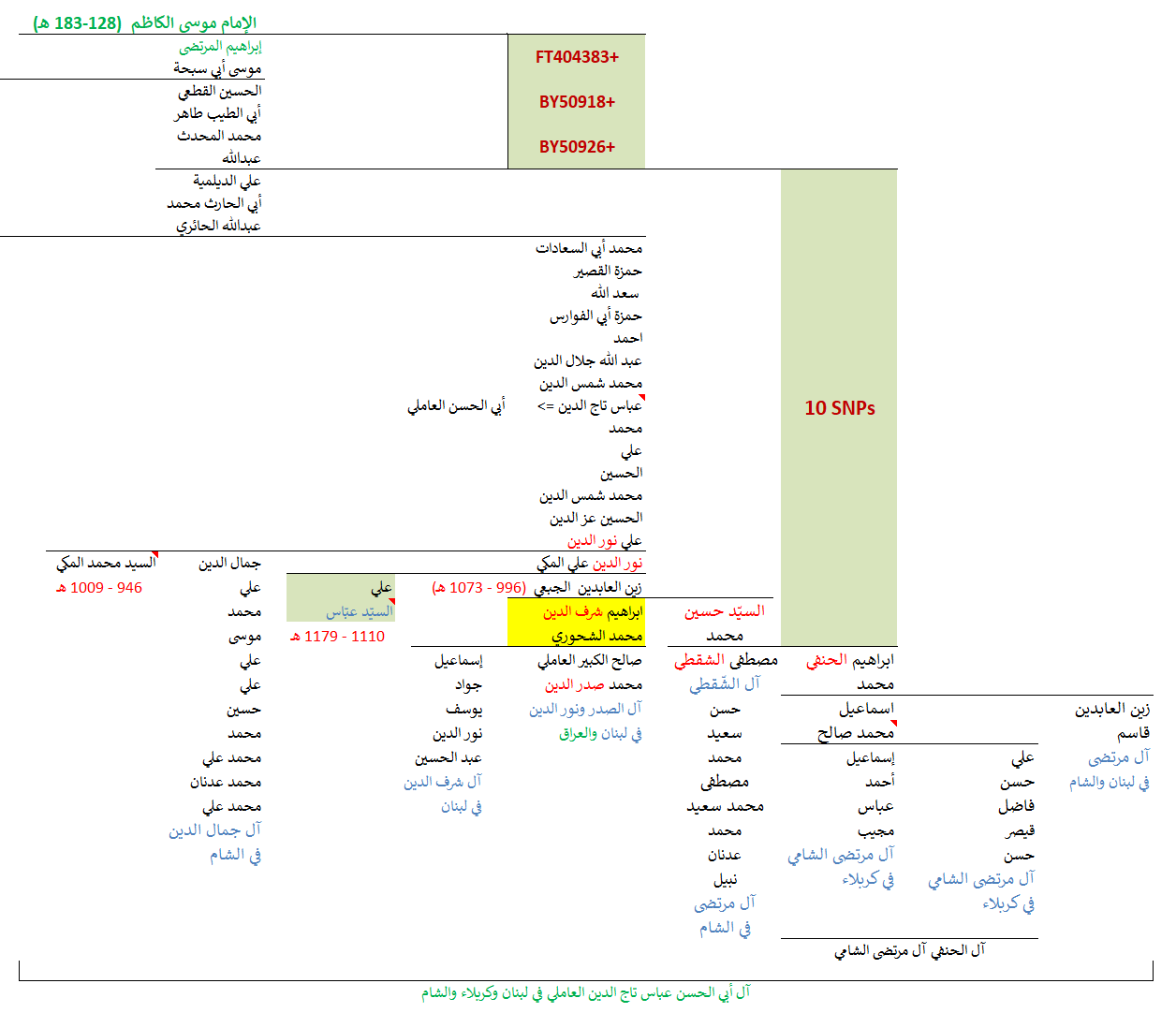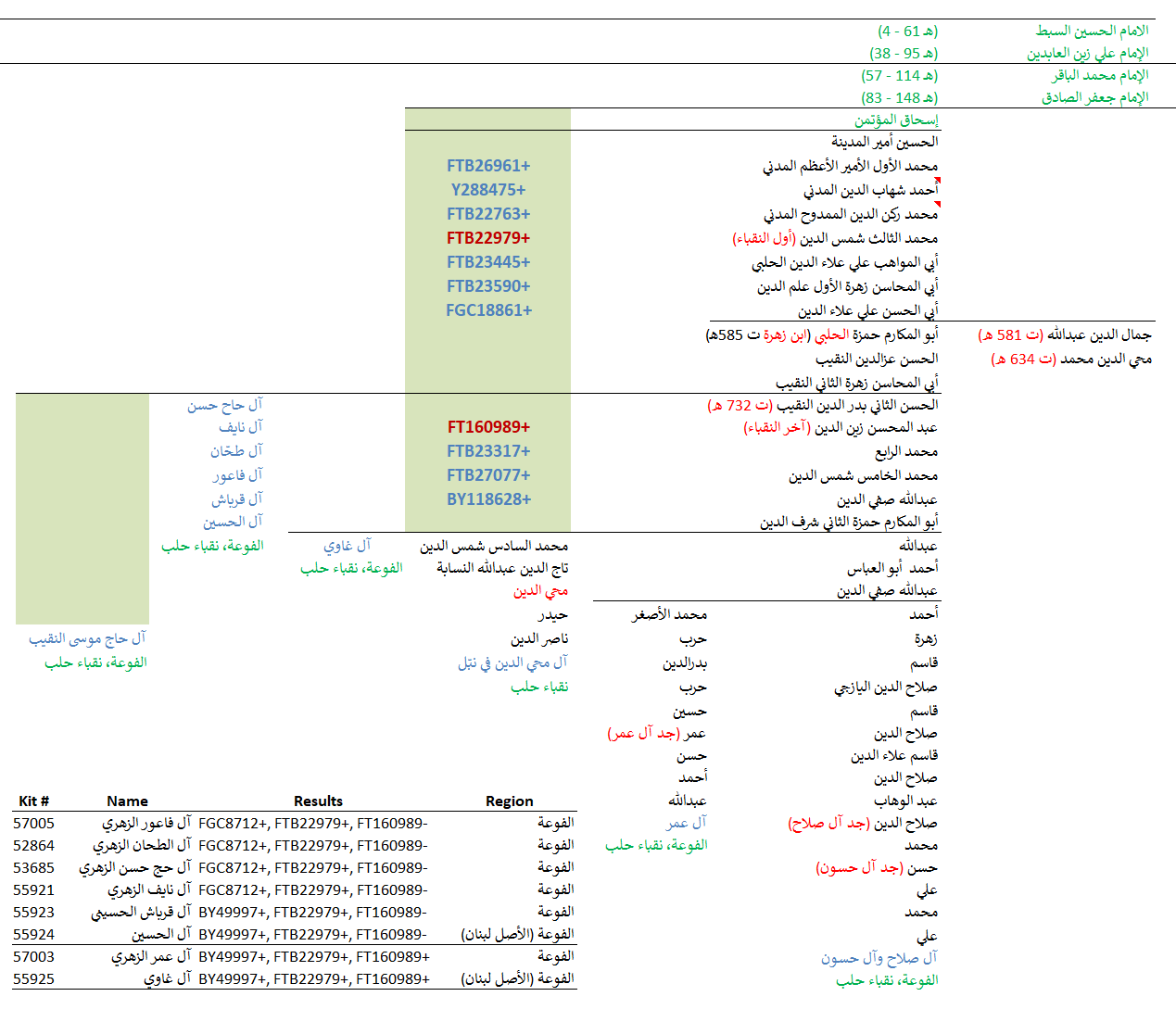 - مواضيع مُتعلّقة: نتيجة السادة آل نصرالله Y700 ، نتيجة السادة آل فائز الحُسيني WGS ، نتيجة السادة آل قفطون الحُسيني ، السادة آل فائز ، السادة آل طعمة وآل نصرالله ، نتيجة السادة آل صبح BigY ، نتيجة السادة آل مكّة الحُسيني Y700 ، نتيجة السادة آل خلف العاملي Y700 ، نتيجة WGS للسادة آل جمال الدين مرتضى ، نتيجة WGS للسادة آل مرتضى الشقطي ، تحديث عيّنات السادة آل مرتضى الحُسيني ، نتيجة السادة آل مرتضى الشامي Y700 ، عيّنات السادة آل مرتضى وآل جمال الدين الحُسيني ، تحديث نتائج السادة آل زهرة الحُسينيّين ، ستة نتائج لخط السادة آل زهرة ، تحديث نتائج النقباء آل زهرة الجعافرة ، عيّنات النقباء آل زهرة الإسحاقيين الجعافرة ، نتيجة آل موسى النقيب الزُهري الجعفري Y700 ، نتيجة آل حسّون صلاح الزُهري الجعفري Y700 ، نتيجة آل محي الدين الزُهري الجعفري Y700 ، عيّنة السادة الغرابان الحُسيني Y700 ، نتيجة السادة آل فريهيد Y700 ، نتيجة السادة الجميعان BigY ، نتيجة السادة الفويه الحُسيني Y700 ، نتيجة الفليجان والحرموس Y700 ، نتيجة السادة الصُليبي الحُسيني Y700 ، نتيجة السادة الكويم العيدي الحُسيني Y700 ، نتيجة السادة القبيه الحُسيني Y700 ، نتيجة آل النجعاوي BigY ، زهرة المقول وفروع بني حسين