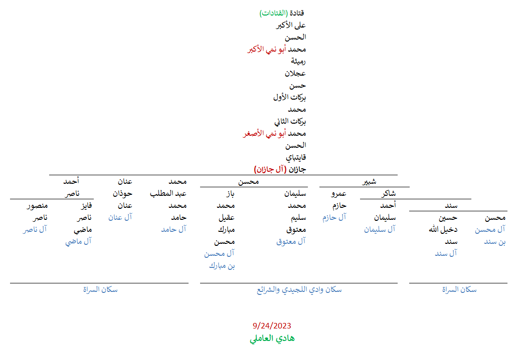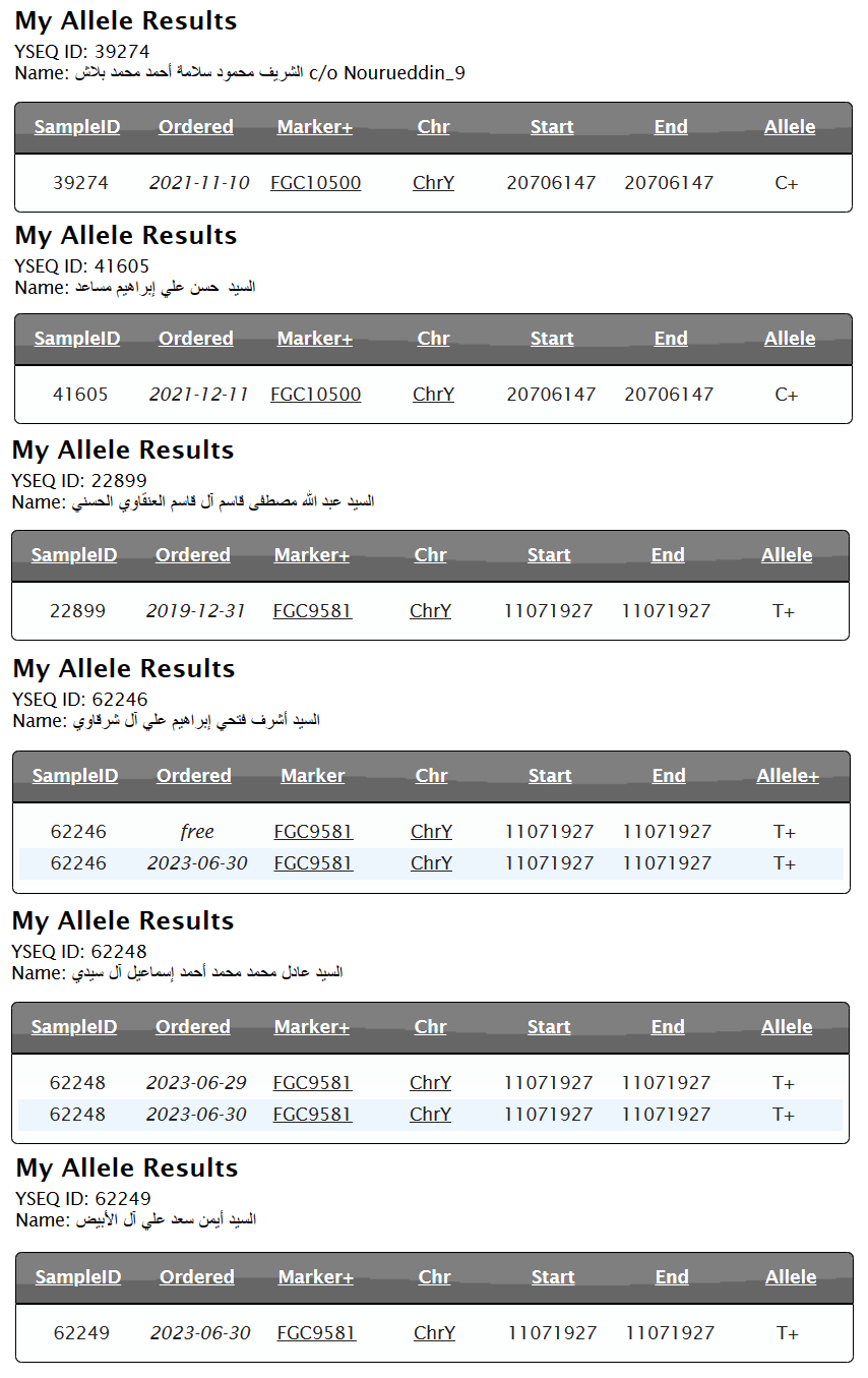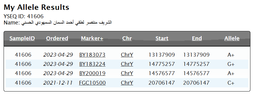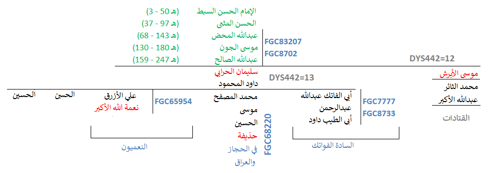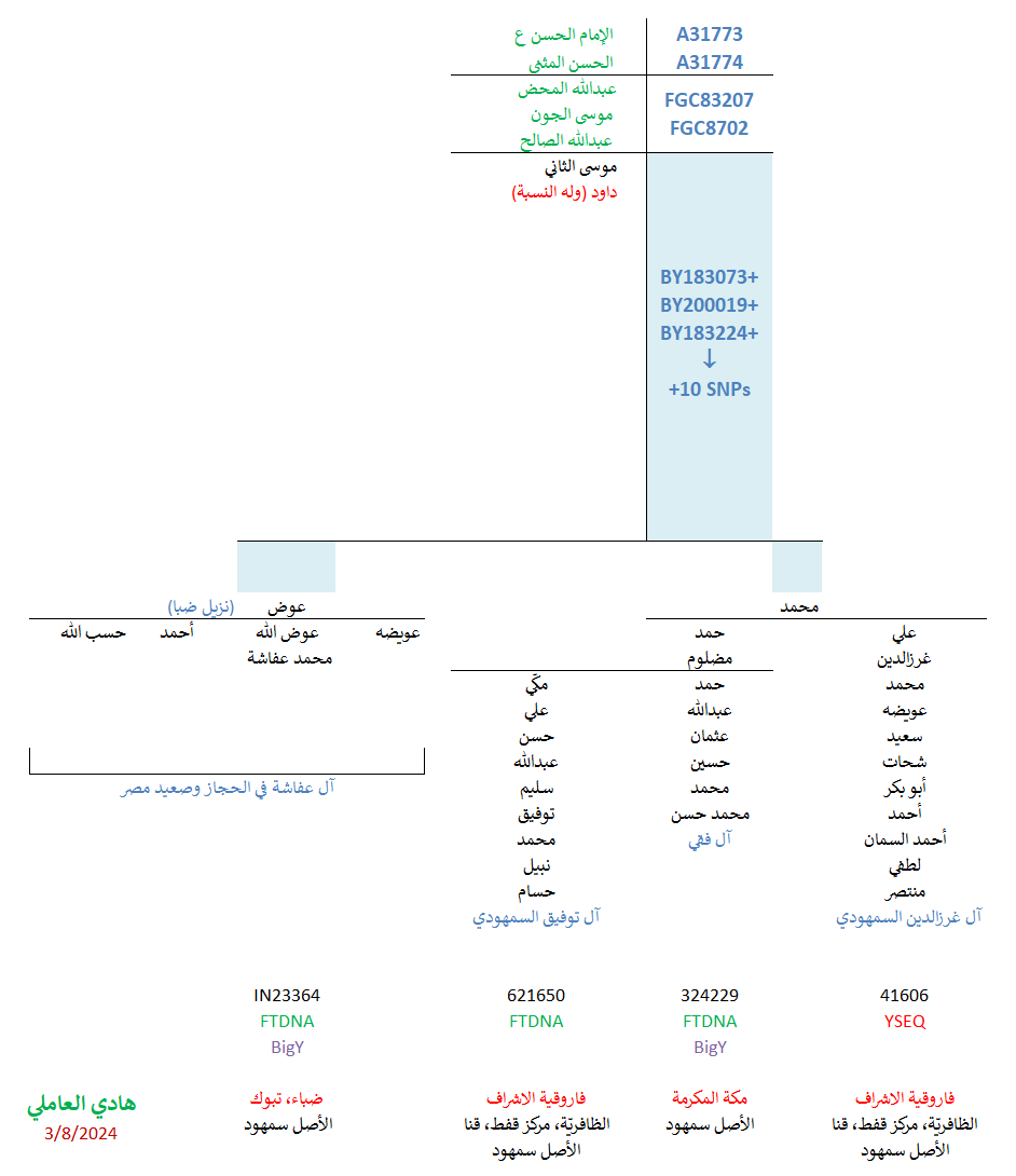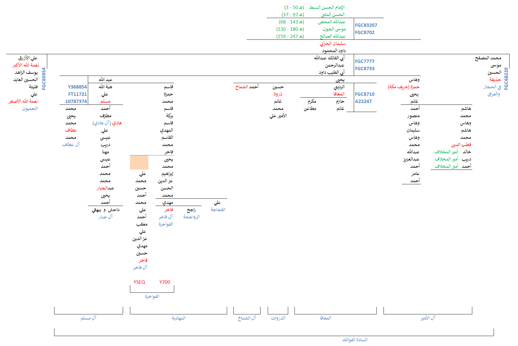 مواضيع مُتعلّقة: نتيجة الأشراف آل سليمان الجيزاني النمويّين ، نتيجة Y700 لآل هزّاع آل عون العبادلة ، نتيجة ثالثة للأشراف آل عون العبادلة ، نتيجة الأشراف آل عون العبادلة Y700 ، عيّنات الأشراف العبادلة ، نتيجة الأشراف آل هاشم العبادلة ، نتيجة الأشراف آل صامل العبادلة ، نتيجة الأشراف الفعور العبادلة ، نتيجة خامسة لآل أبو طالب الخيراتي Y700 ، نتيجة رابعة لآل أبو عقيل الخيراتي ، عينة الأشراف آل علي خيرات ، تحديث نتيجة آل خيرات ، تحديث مُشجّر الحرّازت الجيني ، عيّنات الأشراف آل حسن العجالين Y700 ، مُشجّر الأشراف العجالين الجيني ، تحديث نتائج السادة القتادات ، نتيجتيّ Y700 للأشراف الهجاري ، نتيجة Y700 للأشراف العنقاويّة القتادات ، 8 عيّنات للسادة العنقاويّة القتادات الحسنيّين ، نتيجة الأشراف آل فِنْدي العنقاوية ، نتيجة الأشراف العنقاوية ، تحديث نتيجة الأشراف المجايشة ، ساحل اللآلئ الحسنيّة الموسوية ، شواهد بني محمد الثائر في مكة ، التحور الحسني المحضي الموسوي ، STR النموي