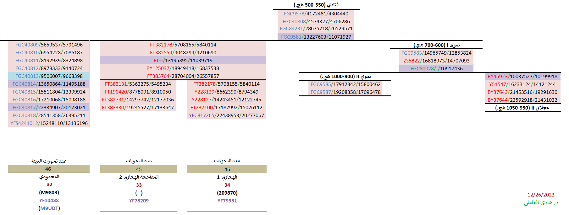 - وقد تمّ تثبيت موقع التحوّر FGC9577 جامعاً لكافّة السادة النمويّين (وليس خاصّاً بذريّة الشريف حسن بن أبي نمي الثاني)، كونه بدا موجباً لعيّنات السادة الخيرات (بعد قراءة ملفات BAM الخاصّة بهم) من جهة وعيّنات ذرّية الشربف حسن بن أبي نمي الثاني (آل عون العبادلة والجودات) من جهة ثانية.