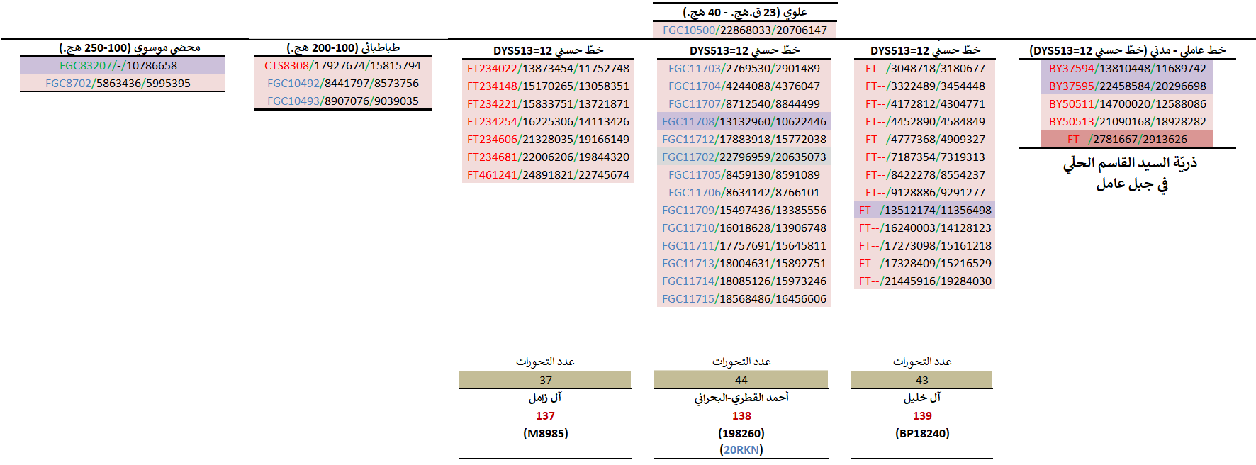 مواضيع مُتعلّقة: نتيجة السادة آل خليل العاملي Y700 ، نتيجة السادة آل خليل العاملي ، نتيجة السادة آل الأمين العاملي Y700 ، نتيجة السادة آل سلمان العاملي Y700 ، نتيجة السادة آل يحيى العاملي Y700 ، نتيجة آل طباجة العاملي Y700 ، نتيجة السادة آل مكّة الحُسيني Y700 ، نتيجة السادة آل خلف العاملي Y700 ، نتيجة السادة آل صبح BigY ، نتيجة السادة الزاملي Y700 ، نتيجة السادة آل سيّد محسن الحسني