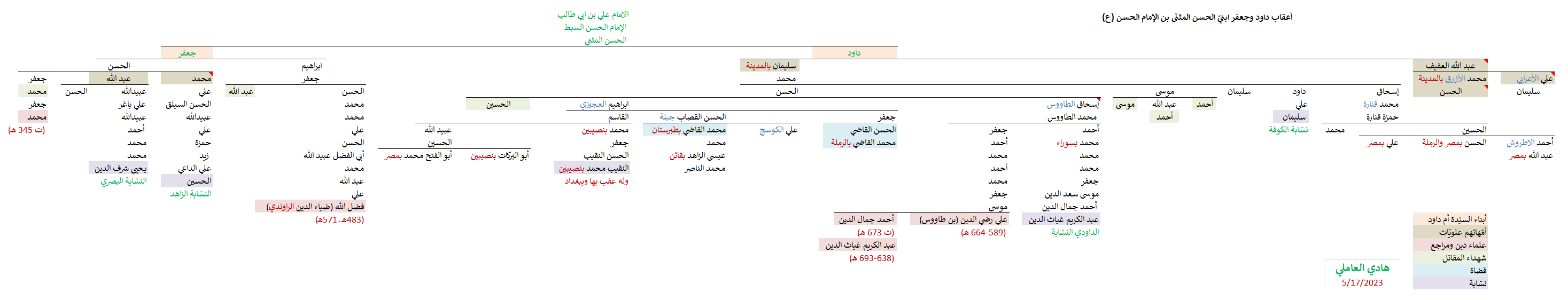 وقد برز عدّة مشاهير وشخصيّات علمائيّة وشهداء (في الثورات العلويّة وفق كتاب المقاتل) وقضاة ونسّابة من ذريّة داود وجعفر ابنيّ الحسن المثنّى وزوجه السيّدة الجليلة ام داود (رضوان الله عليهم). نعرض لكم نسبهم وأسماءهم وجغرافيّتهم في هذا المُشجّر الجميل (الذي سيُعيننا في المستقبل في تحديد الخطوط الحسنيّة الثلاث الباقية):